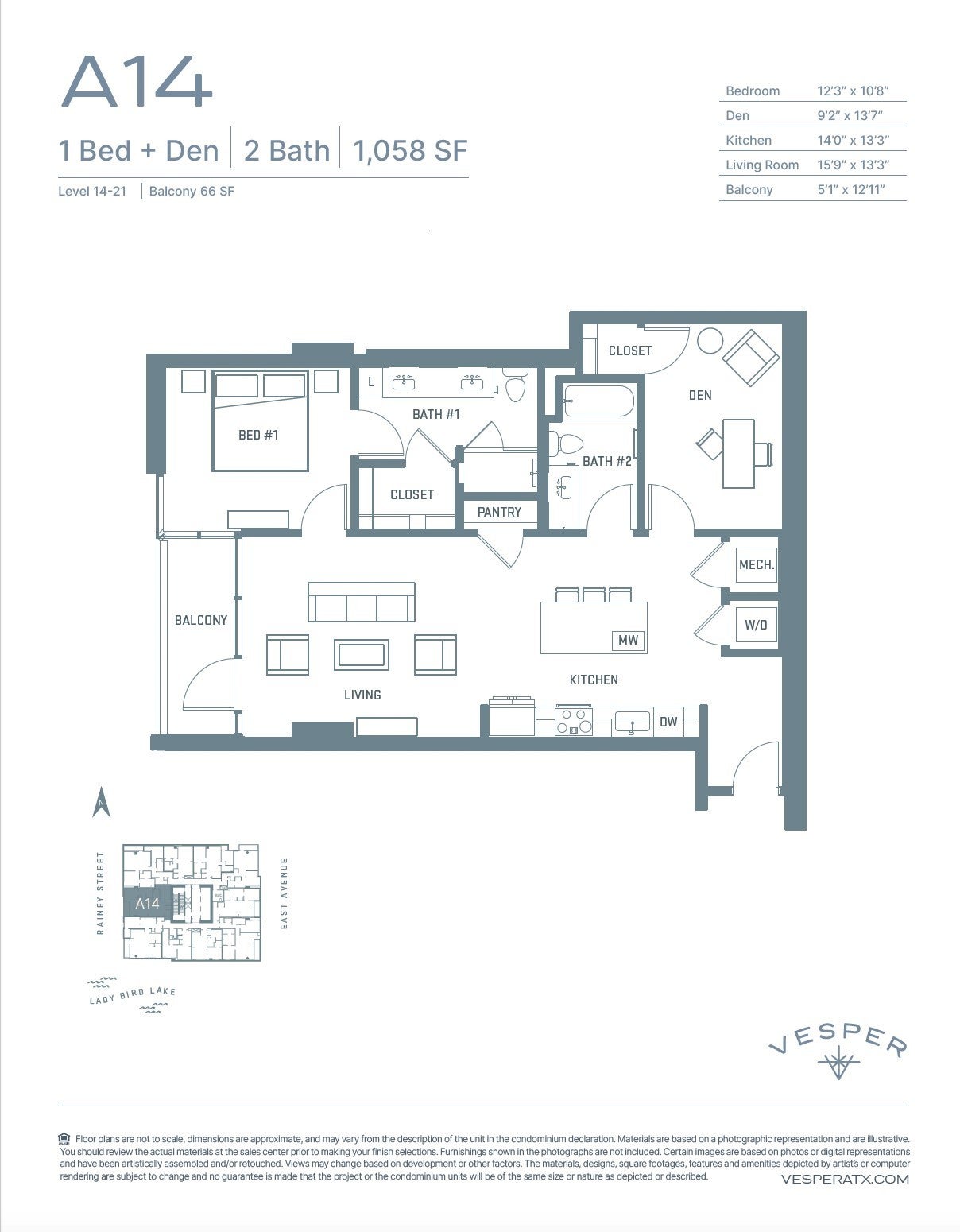 Vesper is a premier luxury condominium community in downtown Austin, offering modern residences with high-end finishes and exceptional amenities. Located steps from Rainey Street and Lady Bird Lake, Vesper provides direct access to Austin’s top dining, nightlife, and outdoor spaces. This unit with West views offers 1 bedroom + den, 2 full bathrooms, and 1058 interior square feet, complemented by a generous balcony overlooking Ladybird Lake and downtown. Floor-to-ceiling windows, high ceilings, and an open-concept layout maximize space and natural light. The kitchen includes Italian cabinetry, terrazzo quartz countertops, and Bosch appliances, while spa-inspired bathrooms feature frameless glass showers and designer fixtures. Residents enjoy 24-hour concierge service, a rooftop lounge, resort-style pool, state-of-the-art fitness center, and private co-working spaces. Vesper’s prime location ensures convenience, whether you're walking to Rainey Street, exploring Ladybird Lake trails, or enjoying the best of Austin living. Contact us today for pricing and availability or to schedule a private tour.