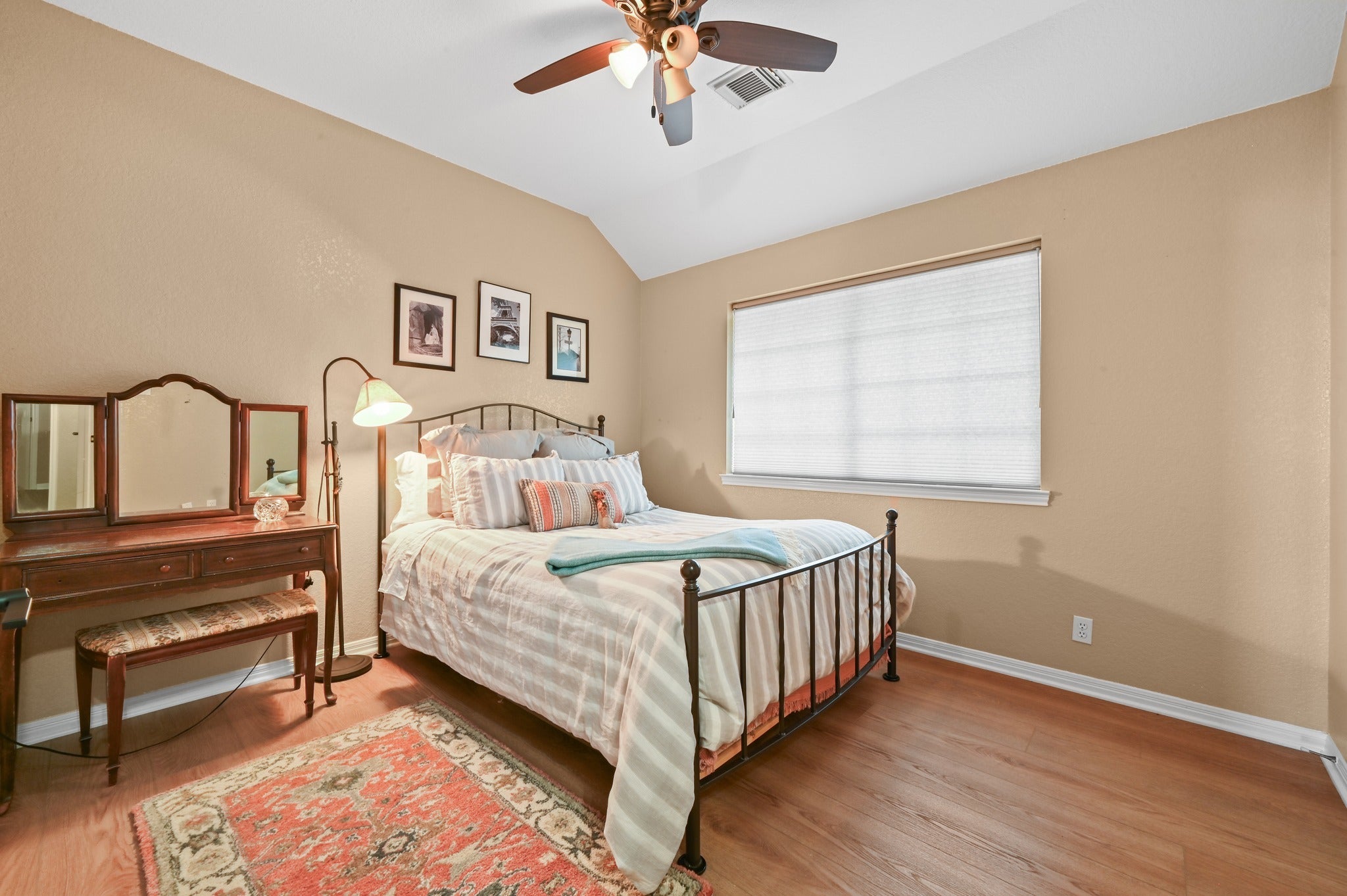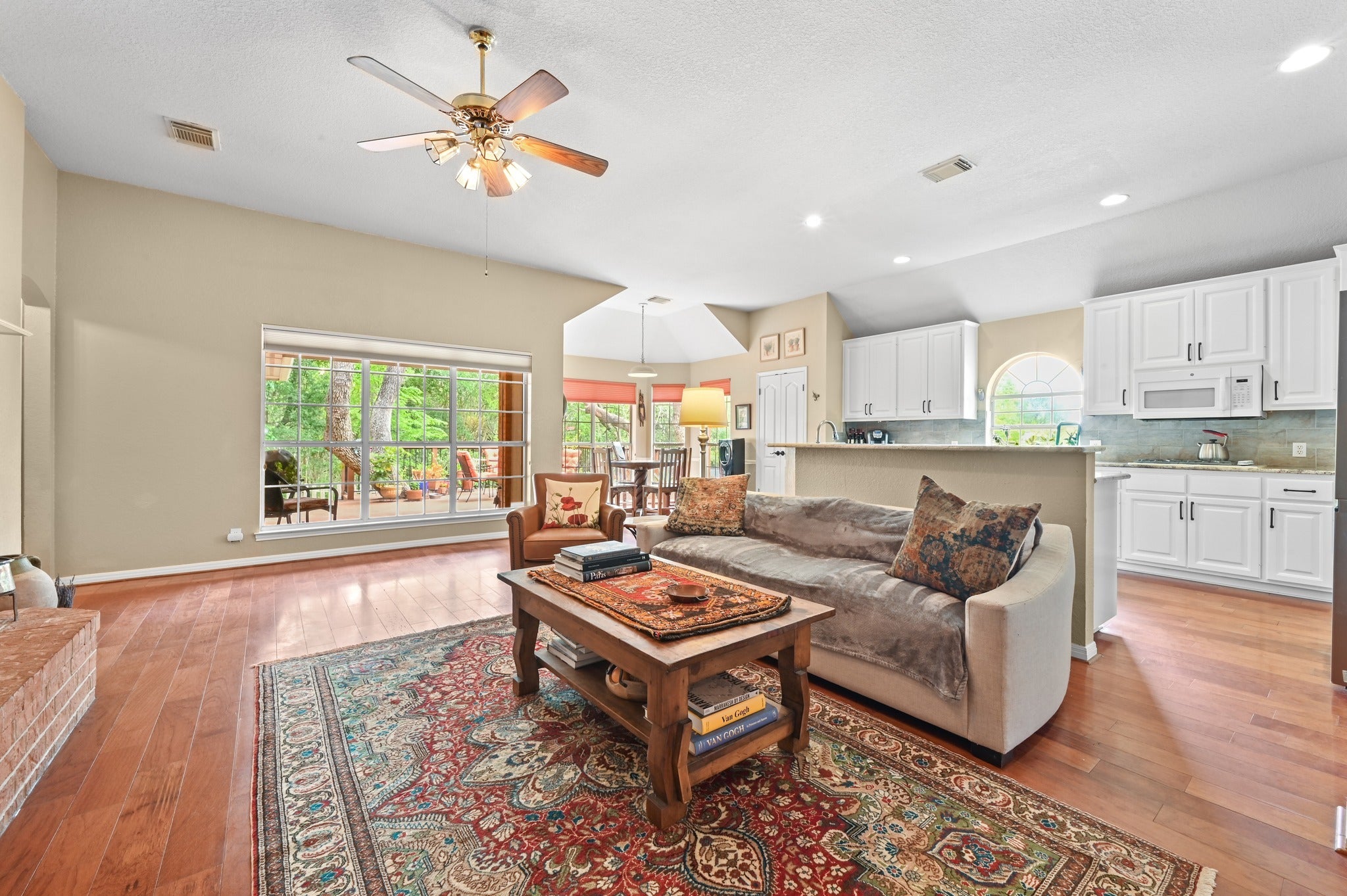 In the heart of Circle C, this beautifully maintained single-story 3 bedroom, 2 bath home offers the perfect blend of comfort, functionality, and thoughtful upgrades—both inside and out. Designed for everyday living and effortless entertaining, the home features two spacious living areas, two dining spaces, and a dedicated library or home office with French doors—ideal for working from home or creating a quiet retreat. Natural light pours through large windows, highlighting the open-concept layout and hardwood floors. The inviting living area centers around a cozy fireplace and flows seamlessly into the kitchen and breakfast space. The kitchen is equipped with granite countertops, abundant cabinetry, and a breakfast bar that opens to the family room—perfect for gathering with friends and family. An eat-in dining area overlooks the peaceful backyard, bringing the outdoors in. The private primary suite offers a true retreat, complete with two generous walk-in closets and an ensuite bath featuring a soaking tub, separate shower, and dual vanities. Two additional bedrooms and a full bath provide comfortable accommodations, with a conveniently located guest bath. Step outside to a tranquil backyard setting with direct access to HOA-owned greenspace. Mature trees provide shade and privacy, and the expansive deck creates the perfect space for relaxing or entertaining year-round. Recently replaced roof for added peace of mind. From the front door ramp to the generous width of the doors and hallways, this home is fully wheelchair accessible without interfering with the aesthetics for homeowners who don’t need to utilize this feature. Zoned to highly sought-after schools including Kiker, Gorzycki, and Bowie. Residents of Circle C enjoy exceptional amenities, including four pools, parks, trails, sports courts, disc golf, and more. Located with easy access to Mopac, HEB, Alamo Drafthouse, and a variety of shops and restaurants—plus just a 20-minute drive to downtown Austin.