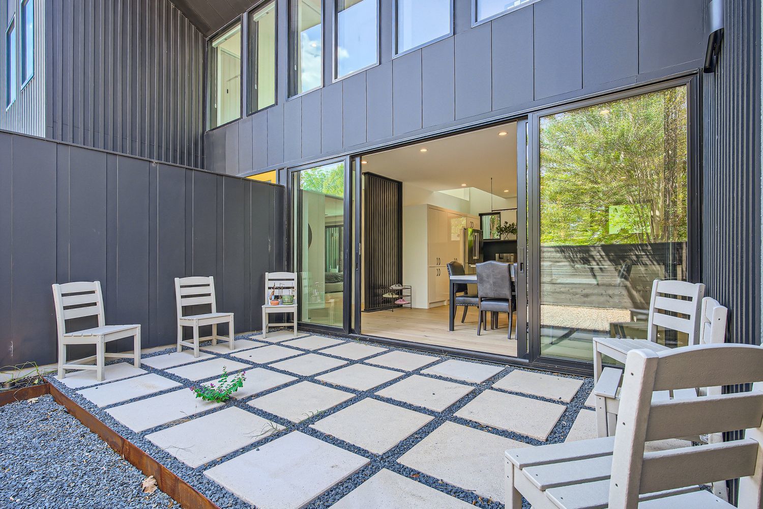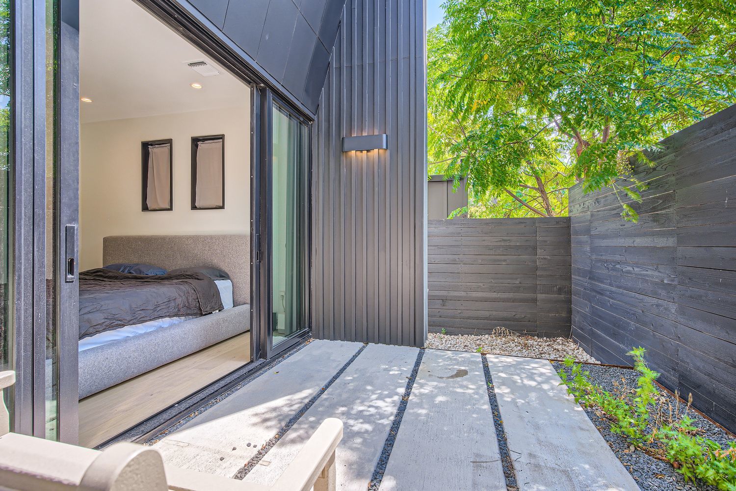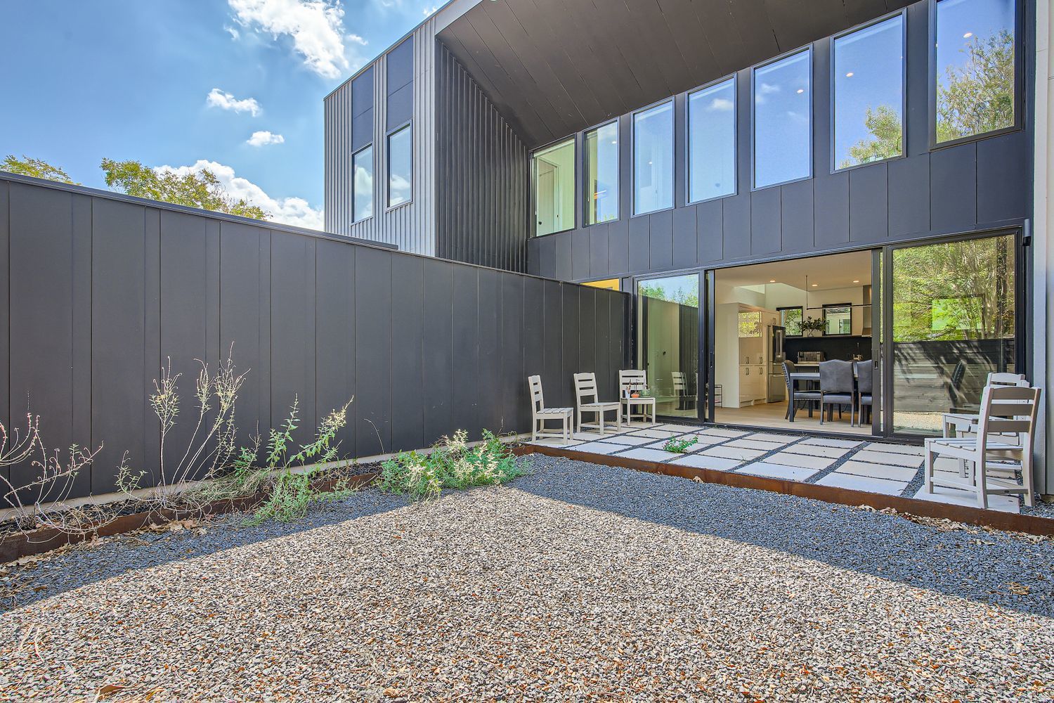 - No Exterior Steps, Rain Gutters, Covered Courtyard, Uncovered Courtyard