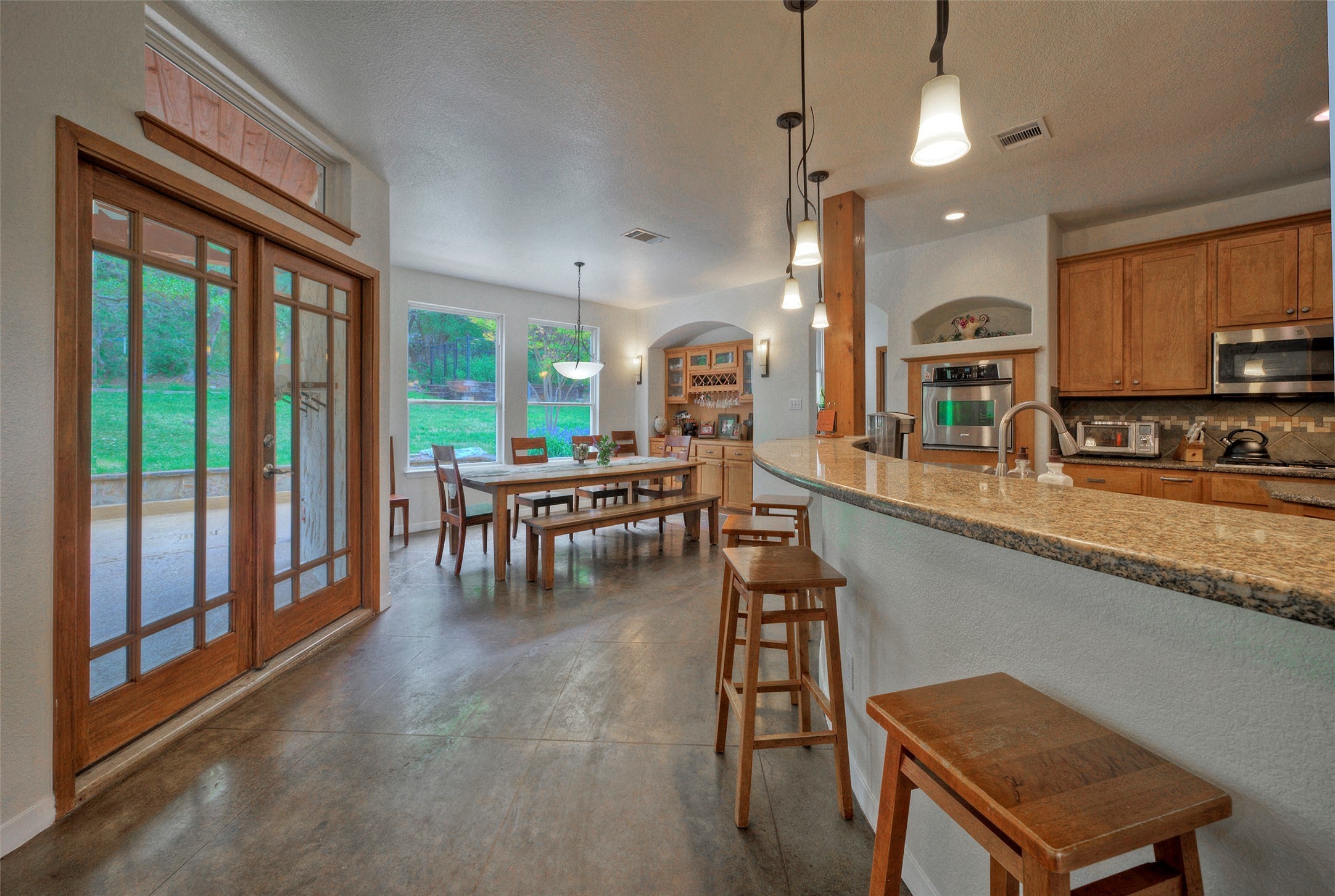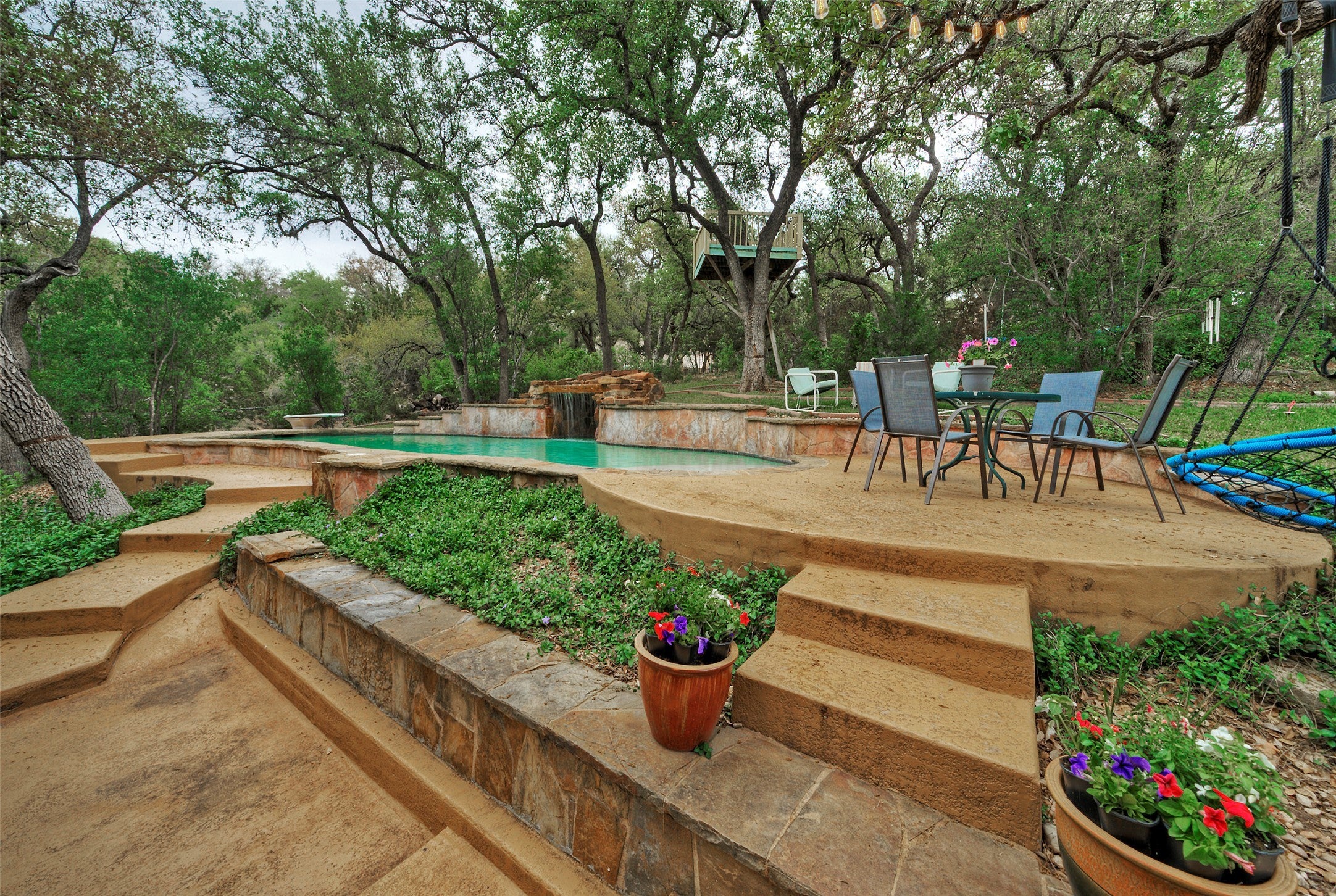 Set on a serene 1.5-acre heavily wooded lot in the sought-after gated community of Gabriels Overlook, this exceptional property offers the perfect blend of privacy, space, and upscale living. Featuring 5 spacious bedrooms and 4 full baths, the home is thoughtfully designed with both comfort and functionality in mind. Inside, you’ll find a dedicated office/study, a versatile game room, and a chef’s kitchen complete with granite countertops, stainless steel appliances, and ample workspace for entertaining or everyday living. The expansive great room showcases a cozy wood-burning fireplace and flows seamlessly into the kitchen, all highlighted by durable and stylish stained concrete floors. Upstairs, there is a game room with all 4 secondary bedrooms feeding off of it. There is also a secret 3rd floor loft with porthole windows overlooking the woods accessible from each of the bedrooms. Step outside to enjoy a covered patio overlooking a beautiful pool with a tranquil waterfall feature—perfect for relaxing or hosting gatherings. The property also includes a fenced raised bed garden, ideal for gardening enthusiasts. The entire property extends beyond the fence for extra privacy. The acreage is blessed with huge trees, and a lovely wet weather creek. A stately entrance welcomes you home, while the 3-car garage with an additional workshop area provides plenty of space for storage, hobbies, or projects. Ideally located just minutes from the charm of Georgetown and its historic square, as well as the peaceful community of Liberty Hill, you’ll enjoy convenient access to wonderful dining, shopping, and local attractions. Situated within the acclaimed Liberty Hill ISD, this one-of-a-kind property offers luxury, privacy, and an unbeatable Hill Country lifestyle.