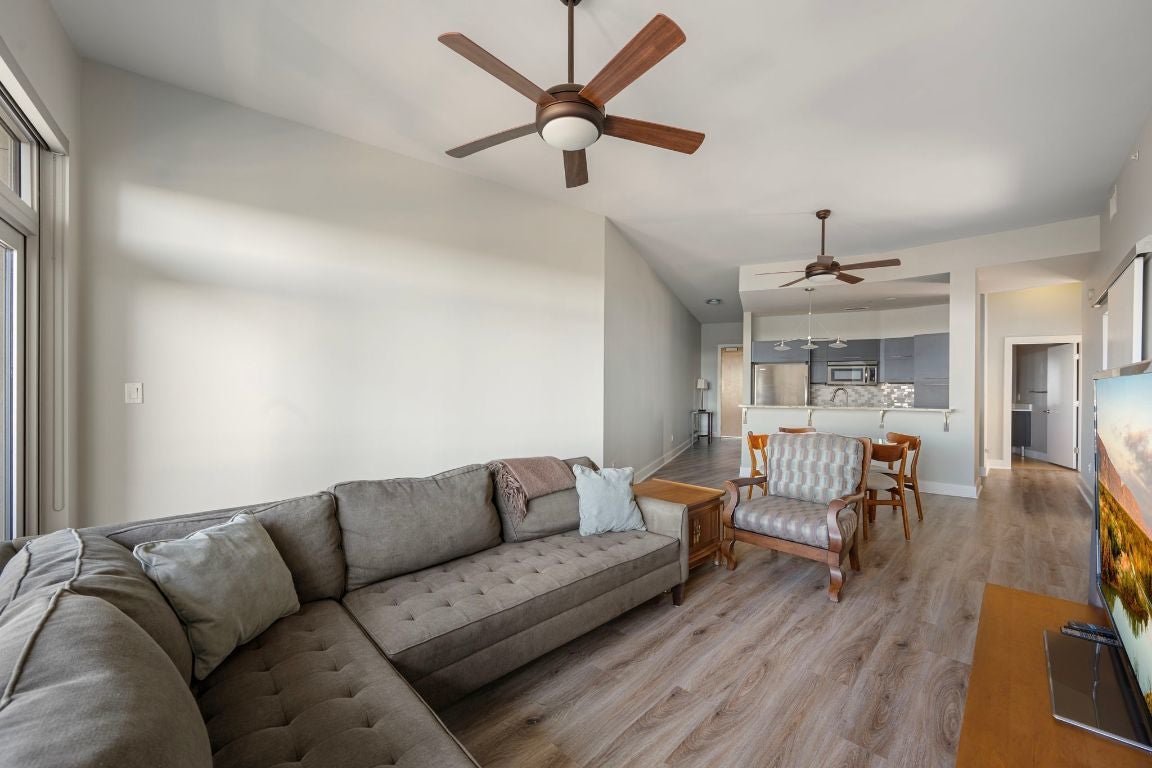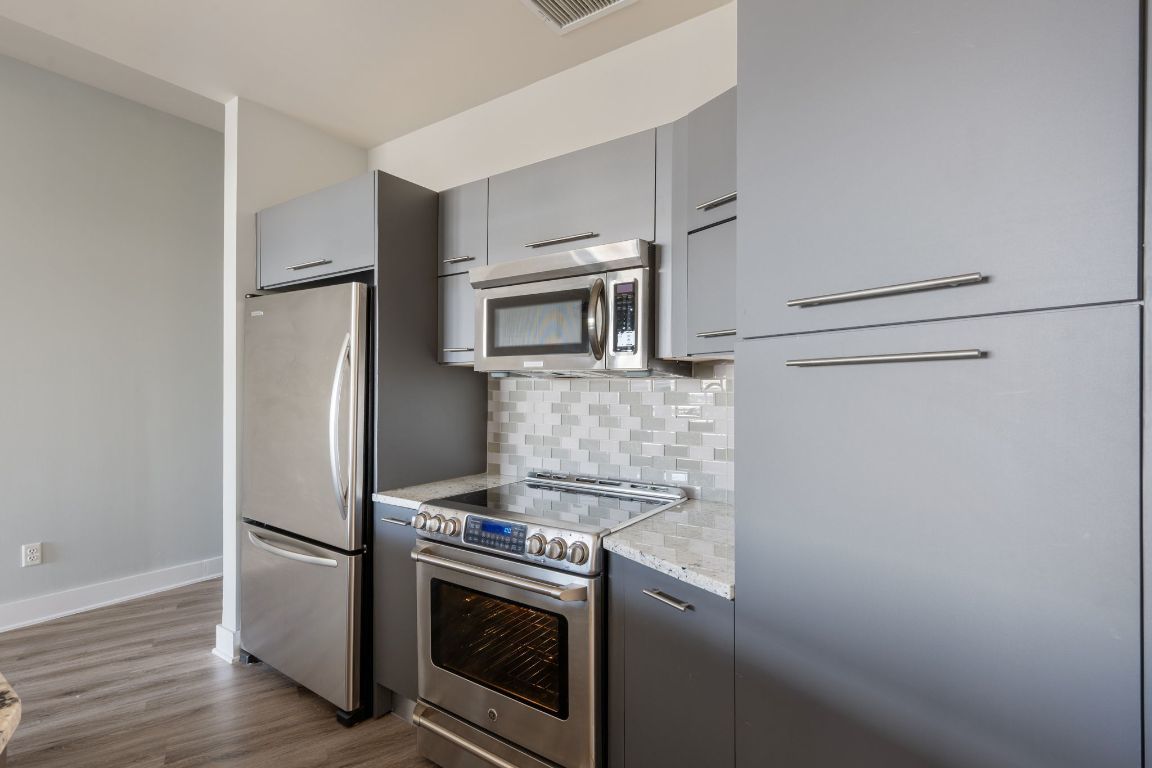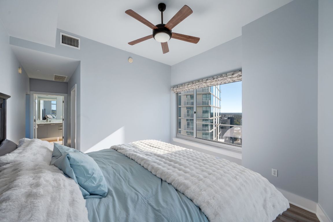 This stylish 2 Bed 2 Bath residence features upgraded hardwood flooring throughout, natural stone countertops with an upgraded backsplash, cabinets, and seamless glass showers in both bathrooms. The primary suite offers a dual vanity and a refined spa-like feel. The thoughtfully designed second bedroom includes a built-in Murphy bed perfect for a turnkey guest room or a flexible office space without sacrificing functionality. Step out onto your private balcony to enjoy downtown views, or take advantage of The Shore’s premier location just steps from Lady Bird Lake, the Hike & Bike Trail, Rainey Street District, top-rated restaurants, nightlife, and minutes from the East Side. Residents enjoy luxury amenities including a fitness center and pool deck, making this an ideal urban retreat in the heart of Austin.