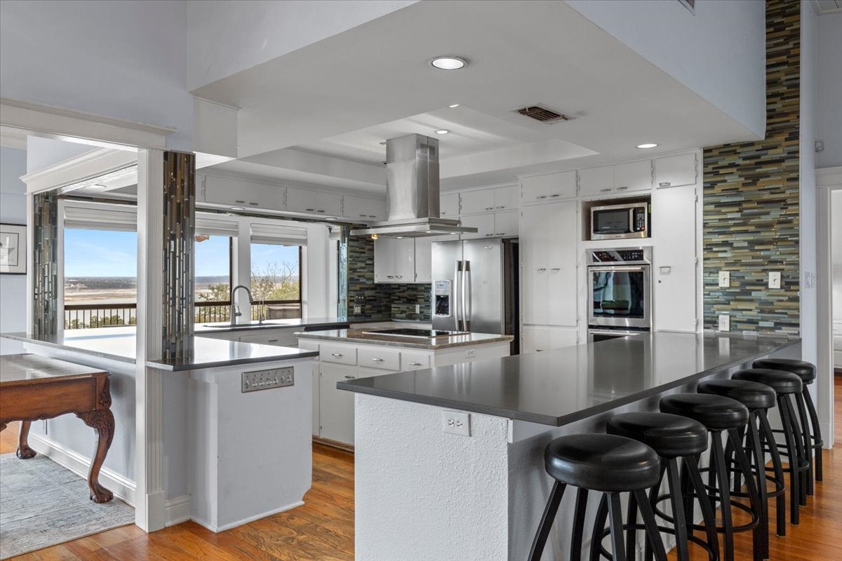 Amazing Views of Lake Travis Main Basin, Pickleball Court, Luxury Pool, 3 car garage. This stunning home is a huge entertainment home that boasts the feeling of being on a vacation everyday with Amazing Lake Travis Views, Pool, Pickleball Court and two spacious decks! This 4500 sq ft home nestled on the hillside above stunning Lake Travis is the perfect home for your family (or multi-family)! This house has 5-bedroom, 4 bathrooms, 2 kitchens, 2 levels with spacious decks, a pickleball court, and a swimming pool. Space for everyone. Including a mother-in-law plan with separate entrance. Your options are limitless! Imagine…. drinking your morning coffee from the upstairs deck (or maybe you’d prefer to be downstairs – multiple decks to choose from). Spending the day swimming in and lounging by the private pool. Playing a game of pickleball on the court. Grilling fresh fish at the outdoor bar. Watching the sunset from the upstairs deck. Roasting marshmallows over the firepit. Serenade your family and friends. This house has everything you could ever need for a home for a lifetime. Great investment for investors for short term or long term rentals. https://hdmediapartners.hd.pics/6714-Mountain-Trail