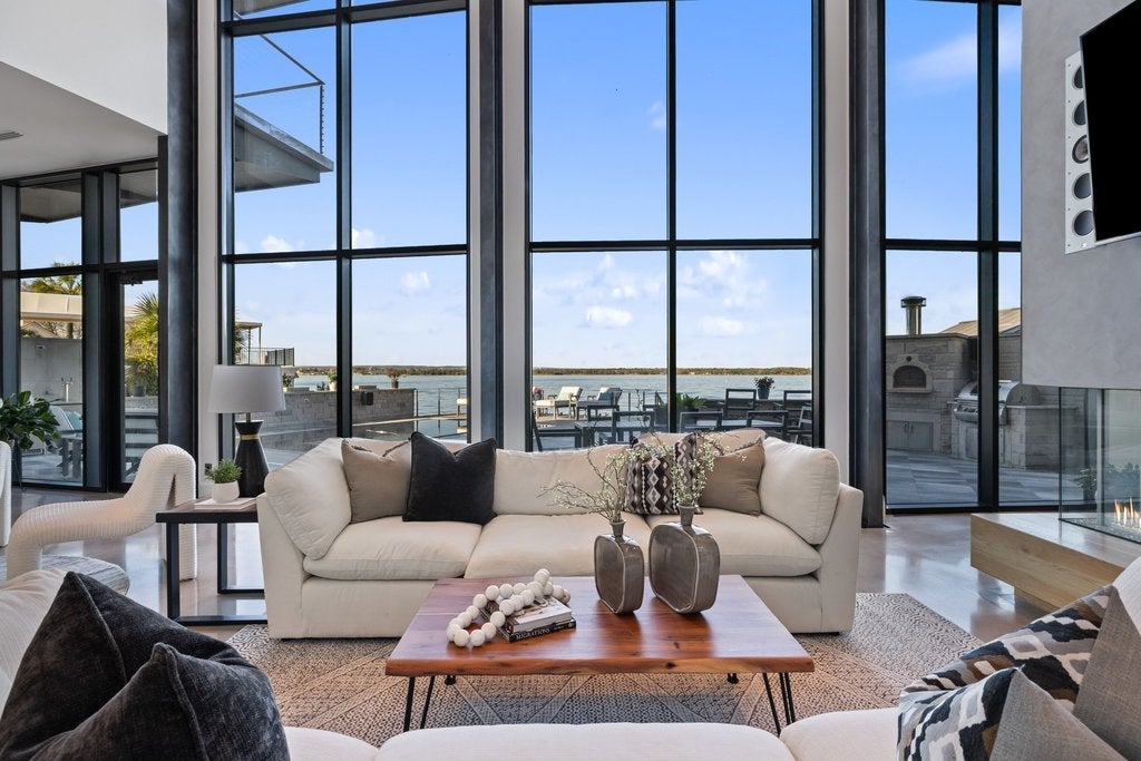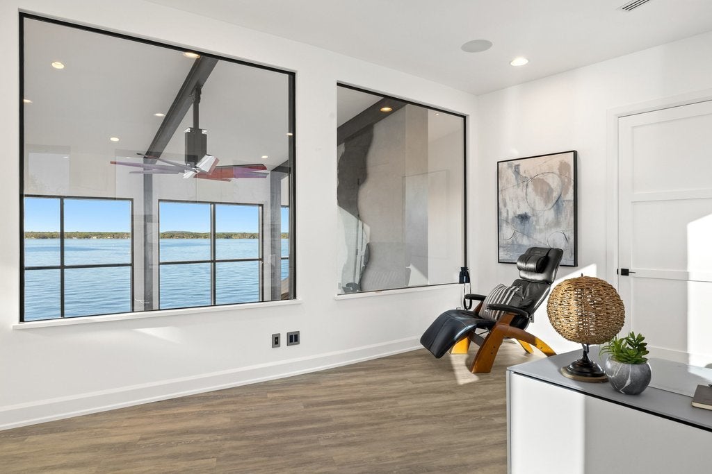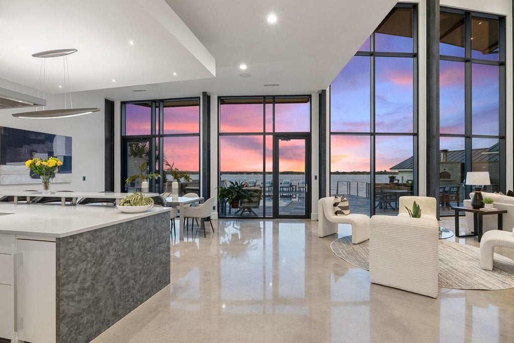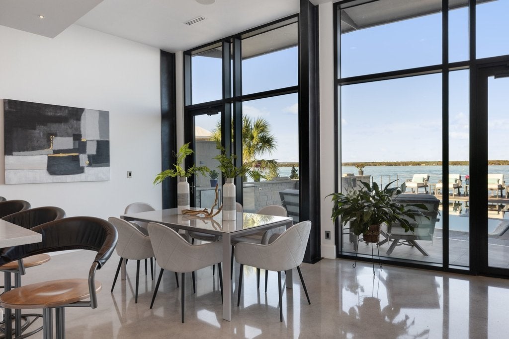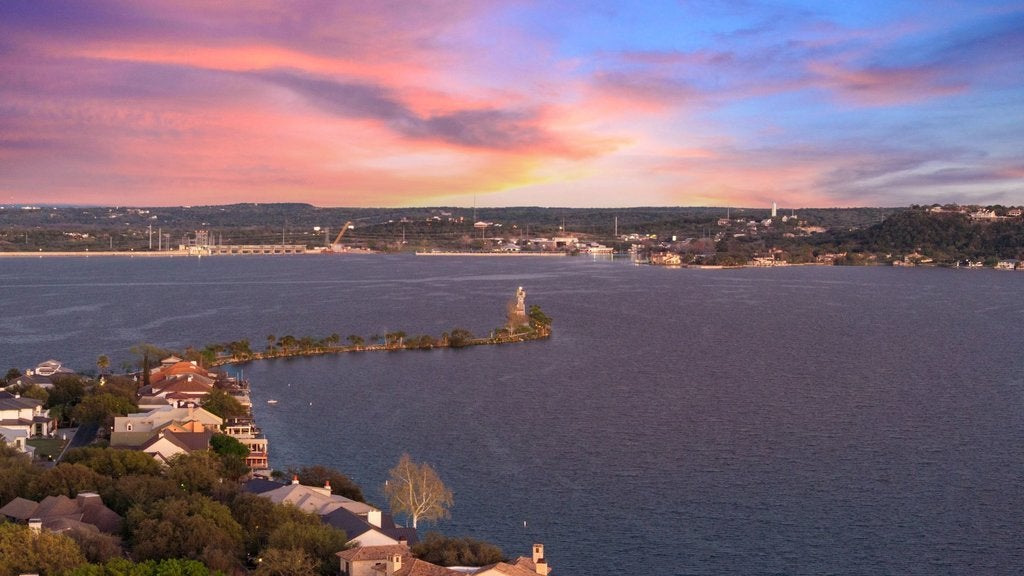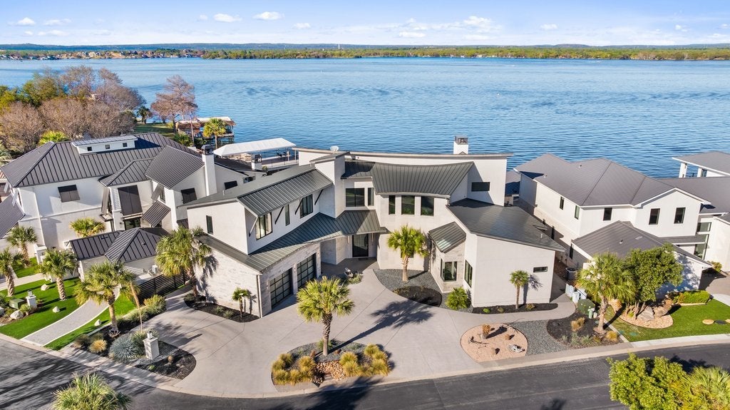 Located in the historic district of Horseshoe Bay, this waterfront property offers a rare opportunity to experience life on Lake LBJ. Just steps from the end of the street is the iconic Horseshoe Bay Lighthouse, the oldest and largest inland lighthouse in Texas. Expansive windows frame stunning lake views and fill the home with natural light. The open-concept design connects the living, dining, and entertaining spaces, creating a functional layout ideal for everyday living or hosting guests. Interior highlights include a built-in golf simulator, refrigerated wine storage, and a striking four-sided fireplace. Outdoor living is designed for entertaining, featuring a 360-degree negative-edge pool and spa overlooking the lake, along with a fully equipped outdoor kitchen. The primary suite offers a private balcony with panoramic lake views, a spacious walk-in closet, and a full-size washer and dryer for added convenience. An elevator provides easy access between both levels, making the home well-suited for multi-generational living. This property captures the essence of the Texas Hill Country lifestyle—boating, golf, and lakeside living all just moments from your door. Information to be independently verfied.