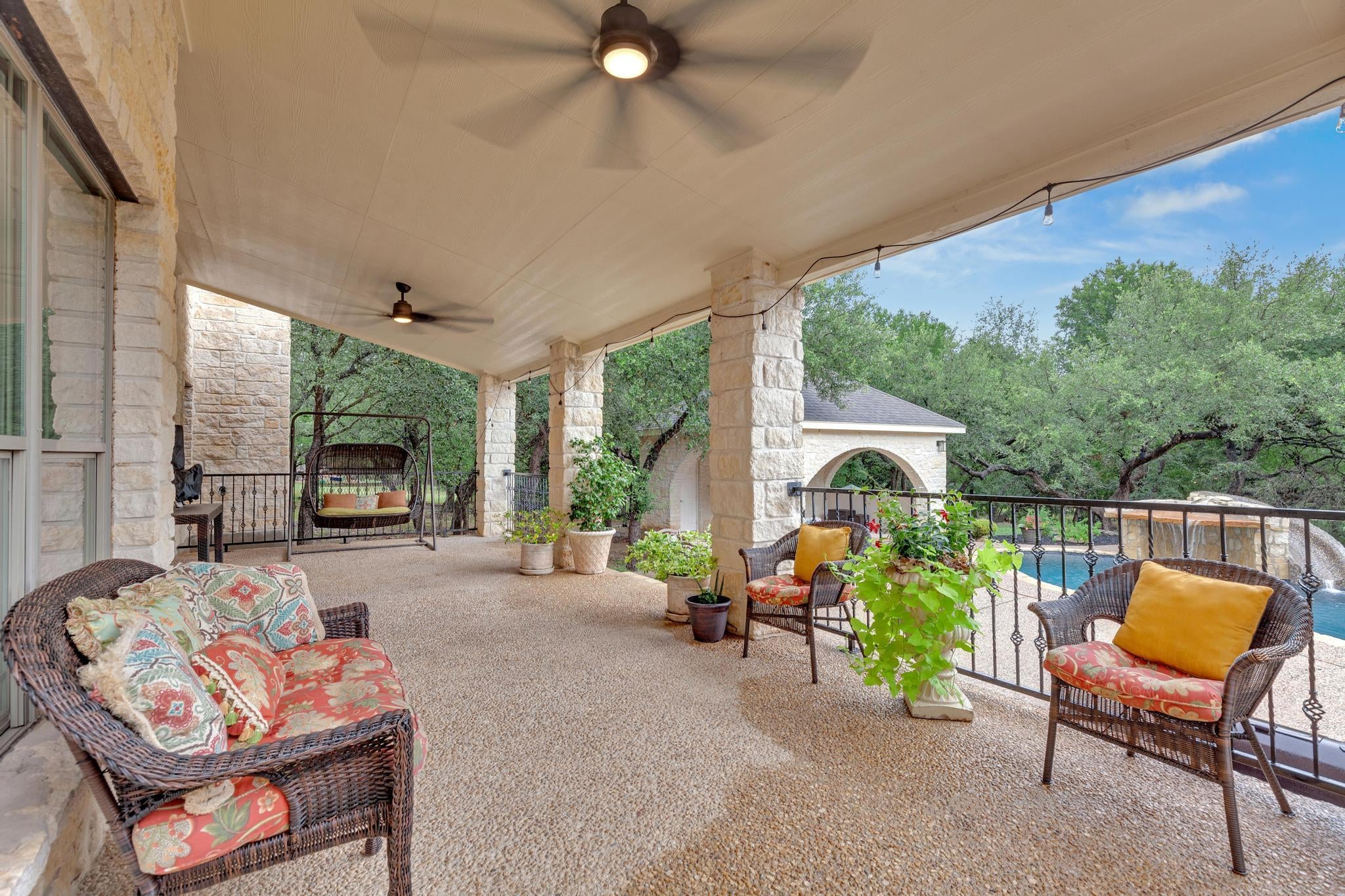 If you’ve been searching for space, privacy, and a home that feels like a private resort—welcome to 1130 Whispering Water. Set on 4.4 acres in Guadalupe River Estates, this 5,729 sq ft custom home delivers the perfect balance of luxury and everyday livability just minutes from Canyon Lake, River Crossing Golf Club, and top-rated Comal ISD schools. From the moment you walk through the double iron doors, you’re greeted with natural light, tray ceilings, rich wood staircases, and custom maple cabinetry throughout. The gourmet chef kitchen is designed to impress, featuring granite countertops, a walk-in pantry, island seating, and seamless flow into multiple living and entertaining spaces. Work from home with ease in the private first-floor office, then unwind in your own speakeasy-style wet bar and entertainment room. Upstairs, a versatile flex space transforms into whatever your lifestyle needs—movie room, second living, or guest retreat. Three fireplaces throughout the home create warmth and elevated ambiance. Step outside and everything changes. This is where the home truly shines—your private recently updated resort-style backyard features a pool with waterfall, slide, spa, cabana, outdoor shower, and space to entertain at any level. Surrounded by mature oak trees, you’ll experience daily visits from deer and native birds, bringing nature right to your doorstep. Oh, lets not forget the seasonal creek that runs at the far end of your property line. Additional features include solar panels, fresh interior paint (2025), a 6-car garage, and expansive parking for guests, RVs, or boats. This property is part of a POA (not HOA) with only $97/year, including access to a private Guadalupe River park—perfect for tubing, fishing, and weekend escapes. Homes like this don’t just offer space—they offer a lifestyle.