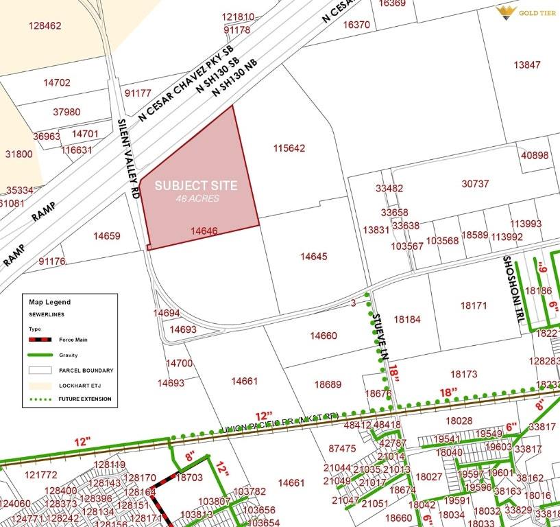 Positioned at one of Lockhart’s most visible and strategic intersections, this ±48-acre tract offers a true hard corner at State Highway 130 and Silent Valley Road, providing unmatched access and visibility to one of Central Texas’s fastest-growing commercial corridors. The property’s dual frontage—nearly 2,800 linear feet of exposure—supports multiple entry points, excellent site circulation, and ideal configuration for high-visibility retail pads, hospital, college, hotel, logistics, or mixed-use development. Located within an Economic Opportunity Zone, the site combines growth-driven fundamentals with potential tax incentives for developers and investors. Surrounded by emerging residential subdivisions and industrial projects, this tract sits squarely in the path of Lockhart's north growth in the ninth fastest growing county (Caldwell) in the country. **Broker does not warrant the accuracy of any information. Buyers are responsible for independent analysis and research on the property.**
