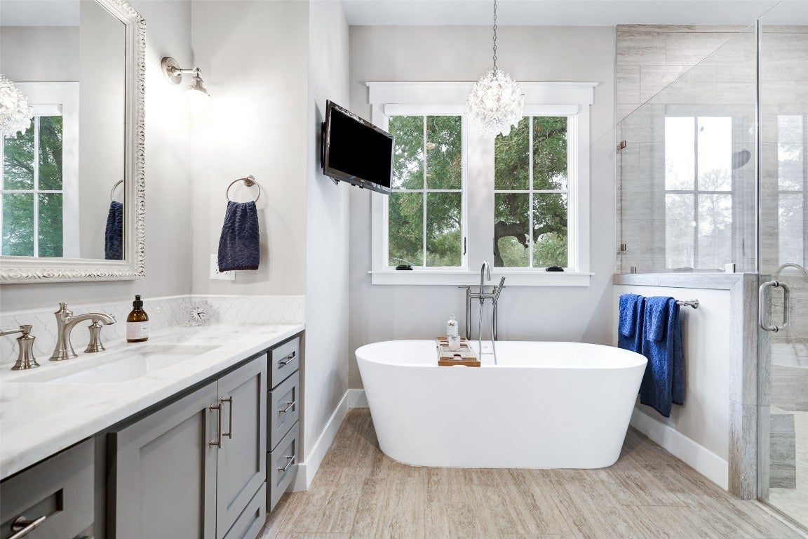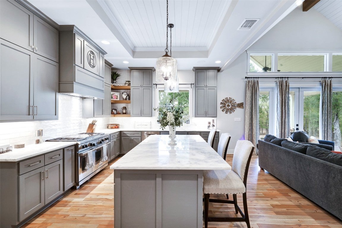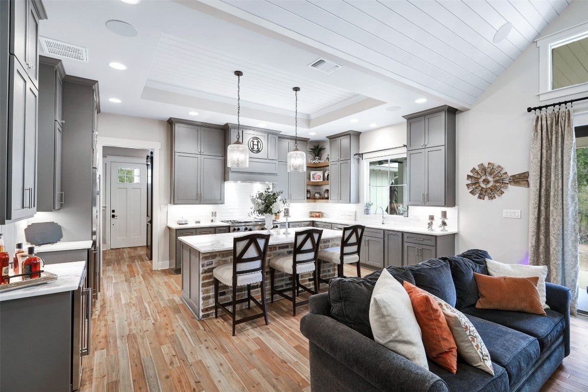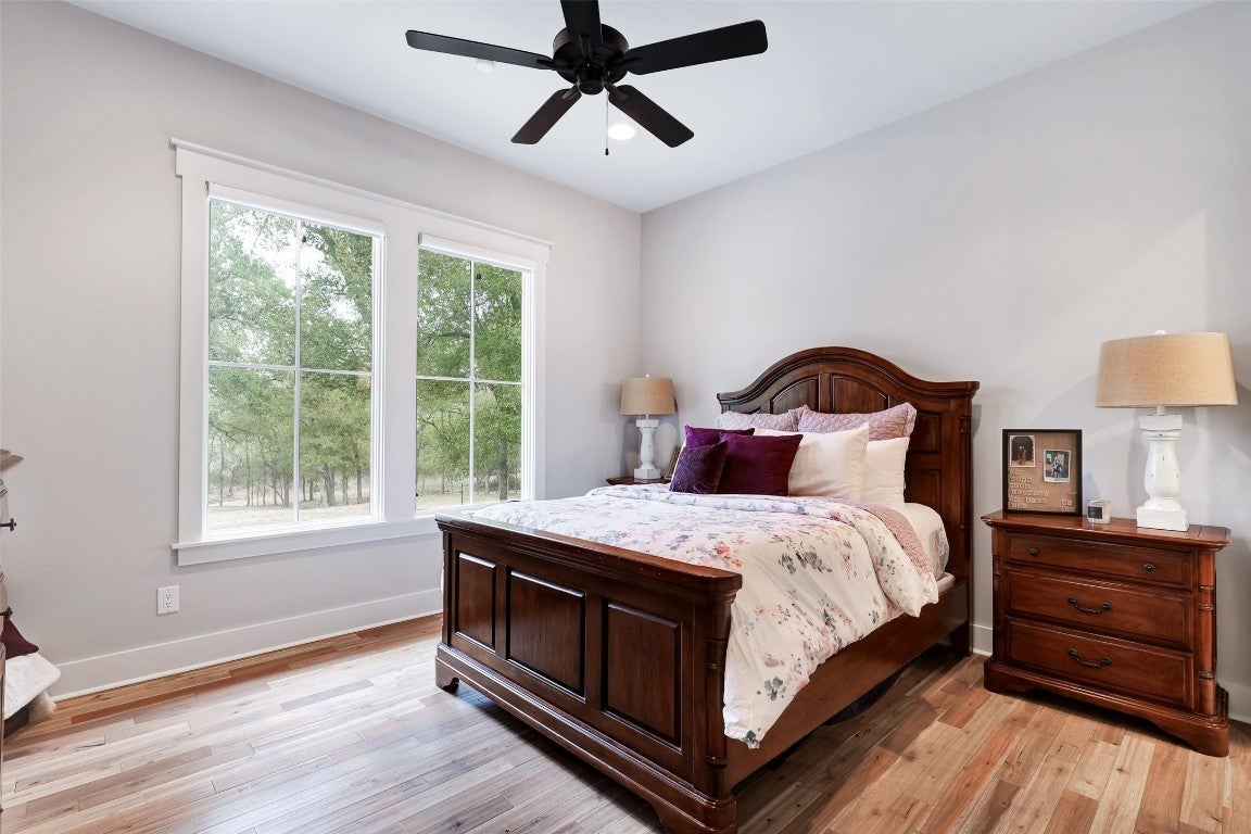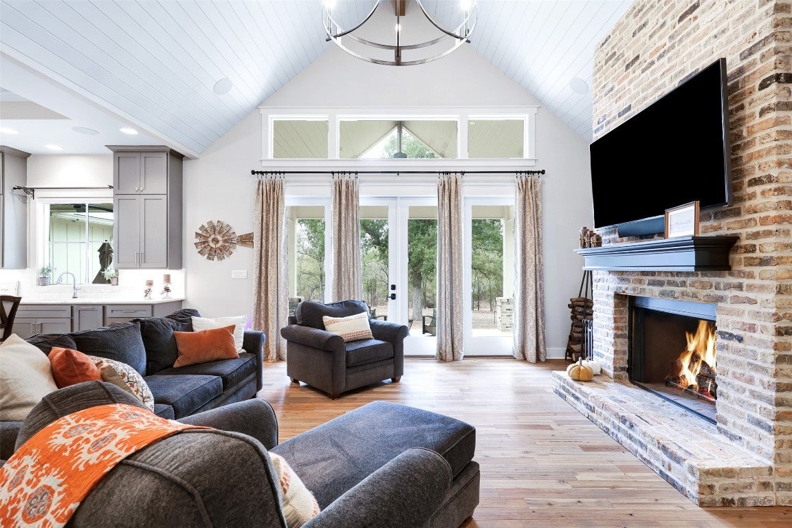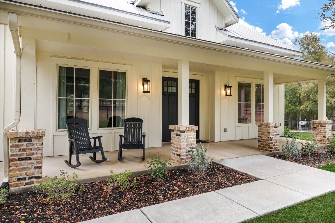 Rustic country life meets modern farmhouse. This masterfully designed, intuitive, and intentional floor plan perfectly blends exquisite design, livability, and overall elegance with plenty of space for living, working, creating, and entertaining. Bright, light-filled rooms open up & let the outside in with this beautiful custom-built estate set back on 11 green tree-lined unrestricted acres. Greeted with a formal dining room and living area, your eyes are immediately drawn to the stone fireplace and shiplap ceilings. Your living room has soaring ceilings and a wall of windows. Transom windows allow natural light to flood into this space. Your gourmet kitchen features an island, quartz counters, pendant lights, a wine fridge and all commercial grade appliances. You'll swoon over your expansive pantry and coffee bar. You have a built-in work area with thoughtful shelves and cabinets. Your primary bedroom is peaceful and serene. Barn doors lead you to your spa-like ensuite. You have his/her double vanities, a luxurious soaking tub, and a walk-in shower. Amazing spacious walk in closet, which connects to your laundry room. Your secondary bedrooms and bathrooms are spacious with many elegant touches. The expansive back patio overlooks the rolling Hill Country, with views of the luscious greenery and sunsets that span for miles. Enjoy the peaceful serenity of this property. Horse enthusiast? Bring your favorite equine to this property. You'll fall in love with the scenic scenes and wildlife. Elevate your lifestyle with this one-of-a-kind property.