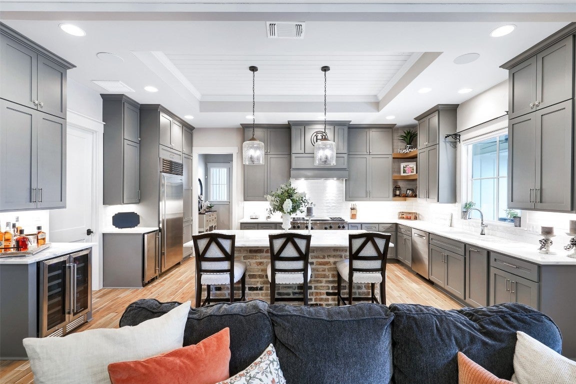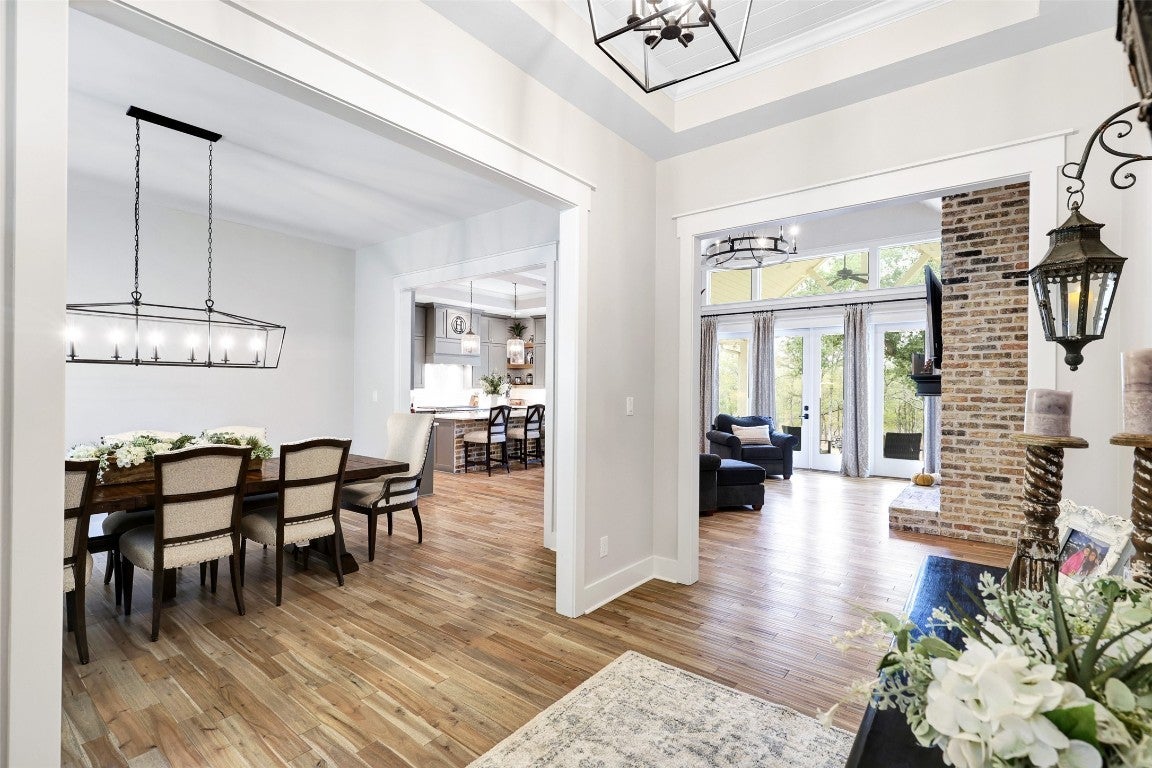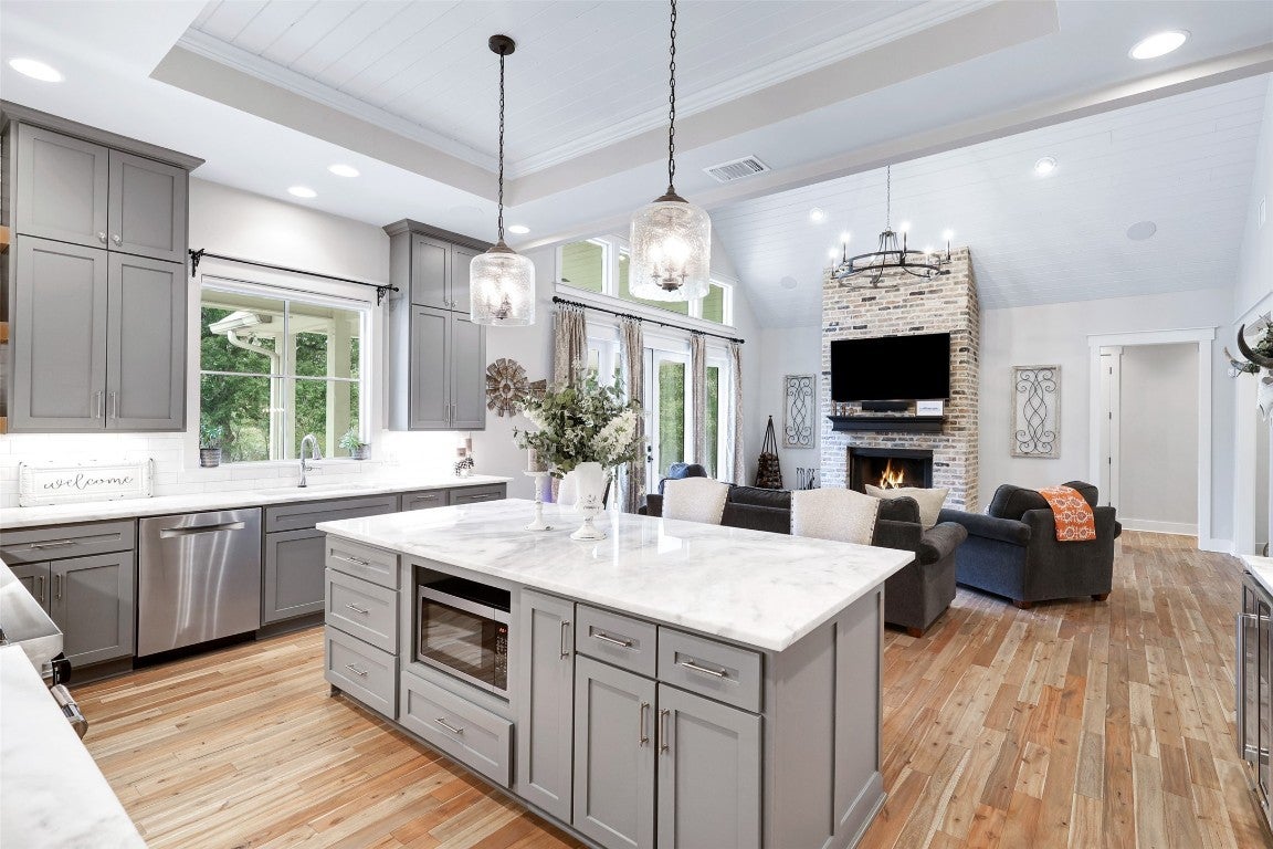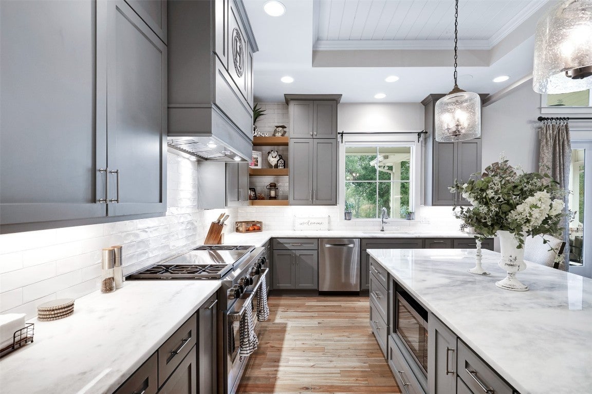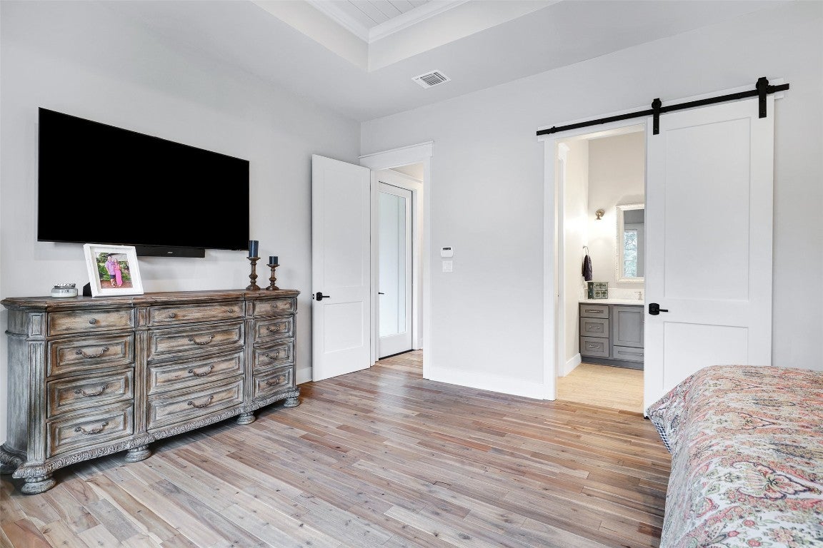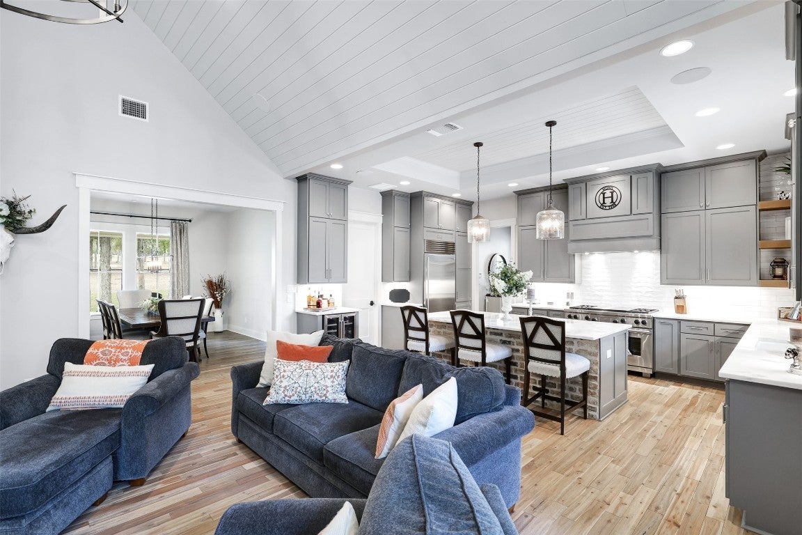 Rustic country life meets modern farmhouse. This masterfully designed, intuitive, and intentional floor plan perfectly blends exquisite design, livability, and overall elegance with plenty of space for living, working, creating, and entertaining. Bright, light-filled rooms open up & let the outside in with this beautiful custom-built estate set back on 11 green tree-lined unrestricted acres. Greeted with a formal dining room and living area, your eyes are immediately drawn to the stone fireplace and shiplap ceilings. Your living room has soaring ceilings and a wall of windows. Transom windows allow natural light to flood into this space. Your gourmet kitchen features an island, quartz counters, pendant lights, a wine fridge and all commercial grade appliances. You'll swoon over your expansive pantry and coffee bar. You have a built-in work area with thoughtful shelves and cabinets. Your primary bedroom is peaceful and serene. Barn doors lead you to your spa-like ensuite. You have his/her double vanities, a luxurious soaking tub, and a walk-in shower. Amazing spacious walk in closet, which connects to your laundry room. Your secondary bedrooms and bathrooms are spacious with many elegant touches. The expansive back patio overlooks the rolling Hill Country, with views of the luscious greenery and sunsets that span for miles. Enjoy the peaceful serenity of this property. Horse enthusiast? Bring your favorite equine to this property. You'll fall in love with the scenic scenes and wildlife. Elevate your lifestyle with this one-of-a-kind property.