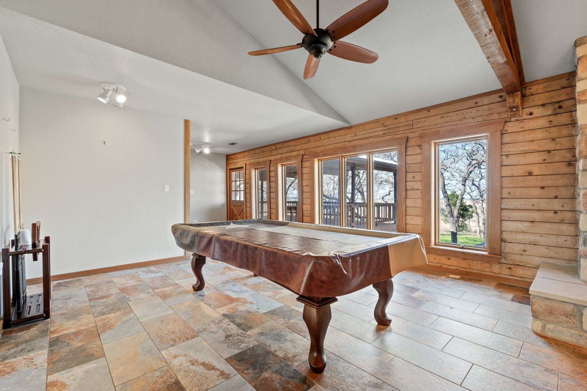 Tucked away on a private driveway, this serene log cabin offers breathtaking views of acres of rolling hills, making it the perfect escape from the hustle and bustle of daily life. Featuring expansive balconies, a sunroom with 10-foot glass windows, and a peaceful, wooded landscape ideal for hiking or horseback riding, this home is a true sanctuary that combines privacy and convenience. Whether you're relaxing on the huge balcony enjoying the stunning views of the adjoining ranch, exploring the woodlands, or enjoying the comfort of this well-appointed cabin, this property promises the ultimate peaceful retreat. Inside, you'll find 3 separate AC heating units to maintain the perfect temperature year-round, as well as 2 cozy wood fireplaces for a warm, inviting ambiance. The chef-inspired kitchen boasts granite countertops, a spacious butcher block central island w/storage, top-of-the-line appliances including a Dynasty gas stove w/7 burners, Samsung fridge, and Bosch microwave, and a large walk-in pantry. There is also a beautiful enclosed sunroom/office on the back of the home w/floor to ceiling windows, slate floors in most rooms, wood beams, tongue/groove wood ceilings and accent walls add to the charm! For outdoor enthusiasts and animal lovers, the property is set up for horses with a walk-in stable, storage barn, and three outbuildings: a workshop, horse storage, and a general storage barn. A dedicated dog yard with year-round artificial turf offers convenience for pet owners, and the carport area includes a 220 plug-in for EV hookups. Perfect for entertaining, the home includes a pool table in the game room area, two wood fireplaces, and ample space for hosting guests. Located just 25 minutes from Austin-Bergstrom International Airport, SpaceX, Twitter, the Boring Company, and 45 minutes from Tesla and the new advanced Terafab building at Giga Texas!