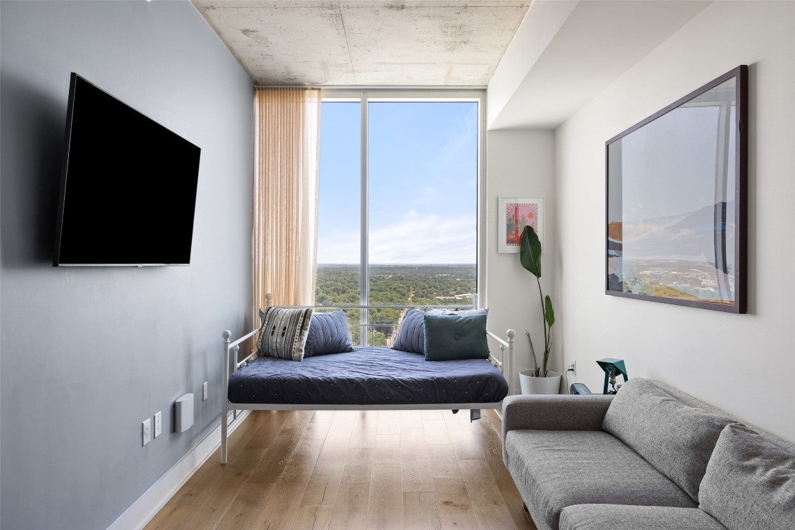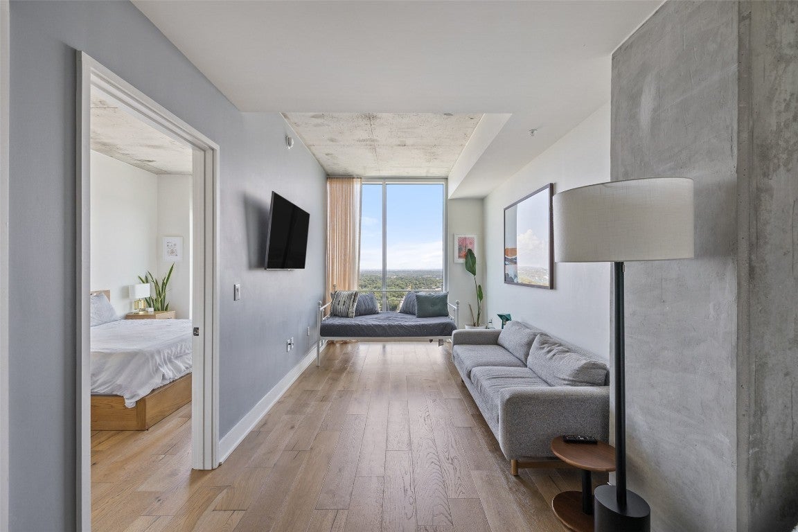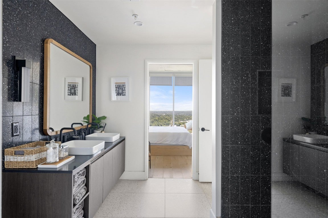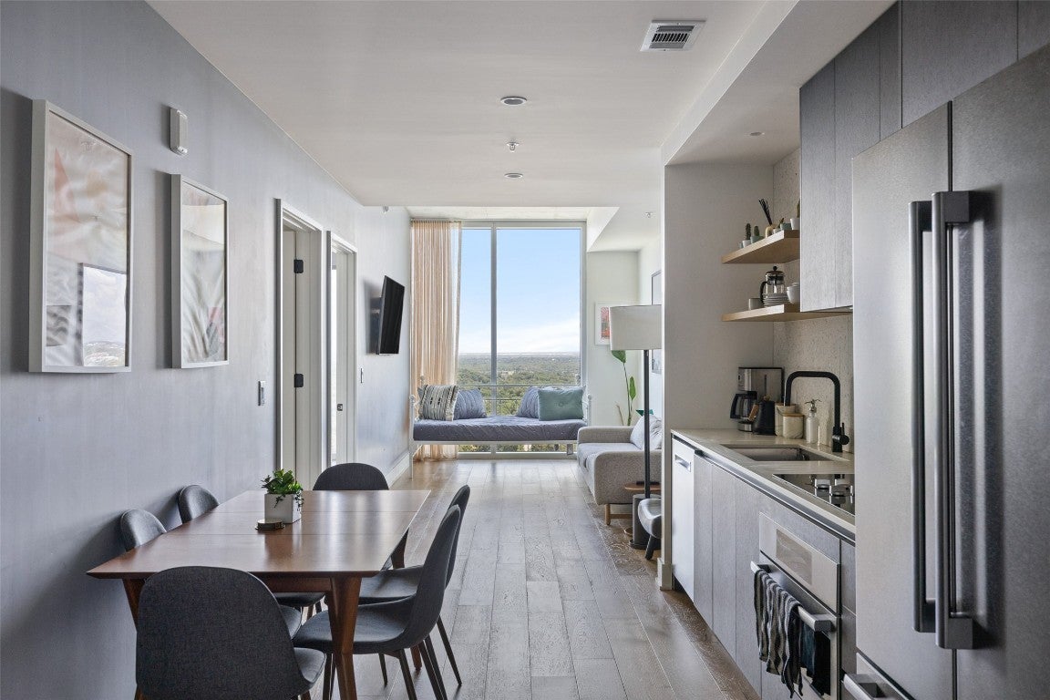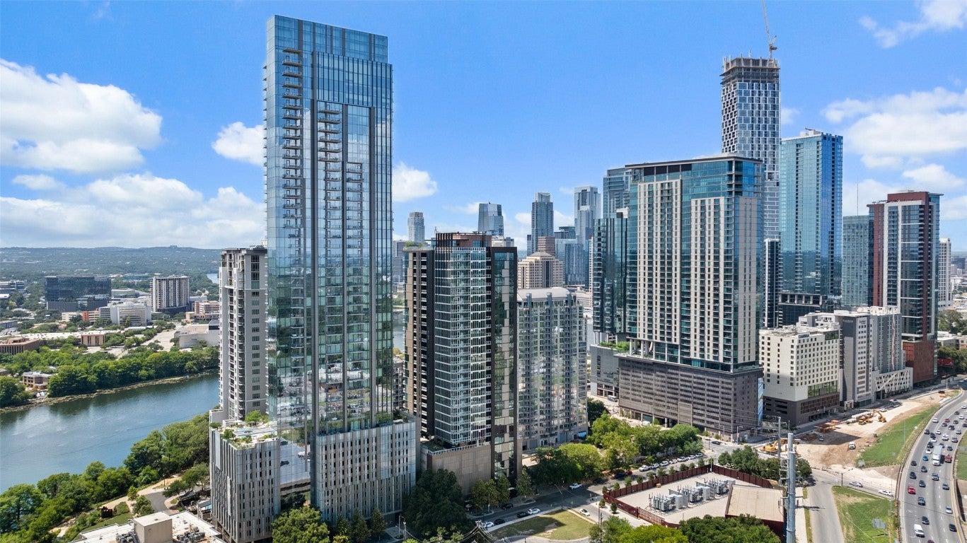Experience sleek, modern downtown living on the 24th floor of Natiivo, Austin’s first and only high-rise condominium licensed for short-term rentals with a turn-key Airbnb service operating within the building. Designed as the ultimate “Austin crash pad,” the condotel is perfect for investors, frequent travelers, or part-time Austinites. This 1-bed, 1-bath unit features an open-concept layout with premium finishes, lofted concrete ceilings, wood floors, and floor-to-ceiling windows in each room, offering beautiful east-facing views of the city and Lady Bird Lake. The kitchen is equipped with quartz countertops and bosch appliances, while the bedroom’s modern ensuite bath features a double vanity and glass-framed walk-in shower. Natiivo offers residents and visitors access to world-class amenities, including 24-hour concierge services for everything from housekeeping to restaurant reservations and itinerary planning. Enjoy the sparkling rooftop pool with skyline views and shaded cabanas, outdoor lounge areas including a terrace and garden, co-working spaces, a state-of-the-art fitness center with yoga & Peloton studios, 33rd floor clubhouse, Cuvee coffee shop & bar in the lobby, bike storage, pet amenities including a pet washing station & dog run, keyless entry, and 24-hour valet parking. Beyond the building’s front door, you are steps away from Rainey Street, Lady Bird Lake, and the hike & bike trail. Airbnb financials are available upon request. All furniture is negotiable with the sale.