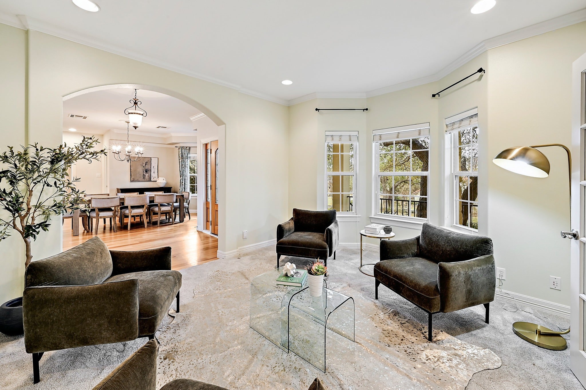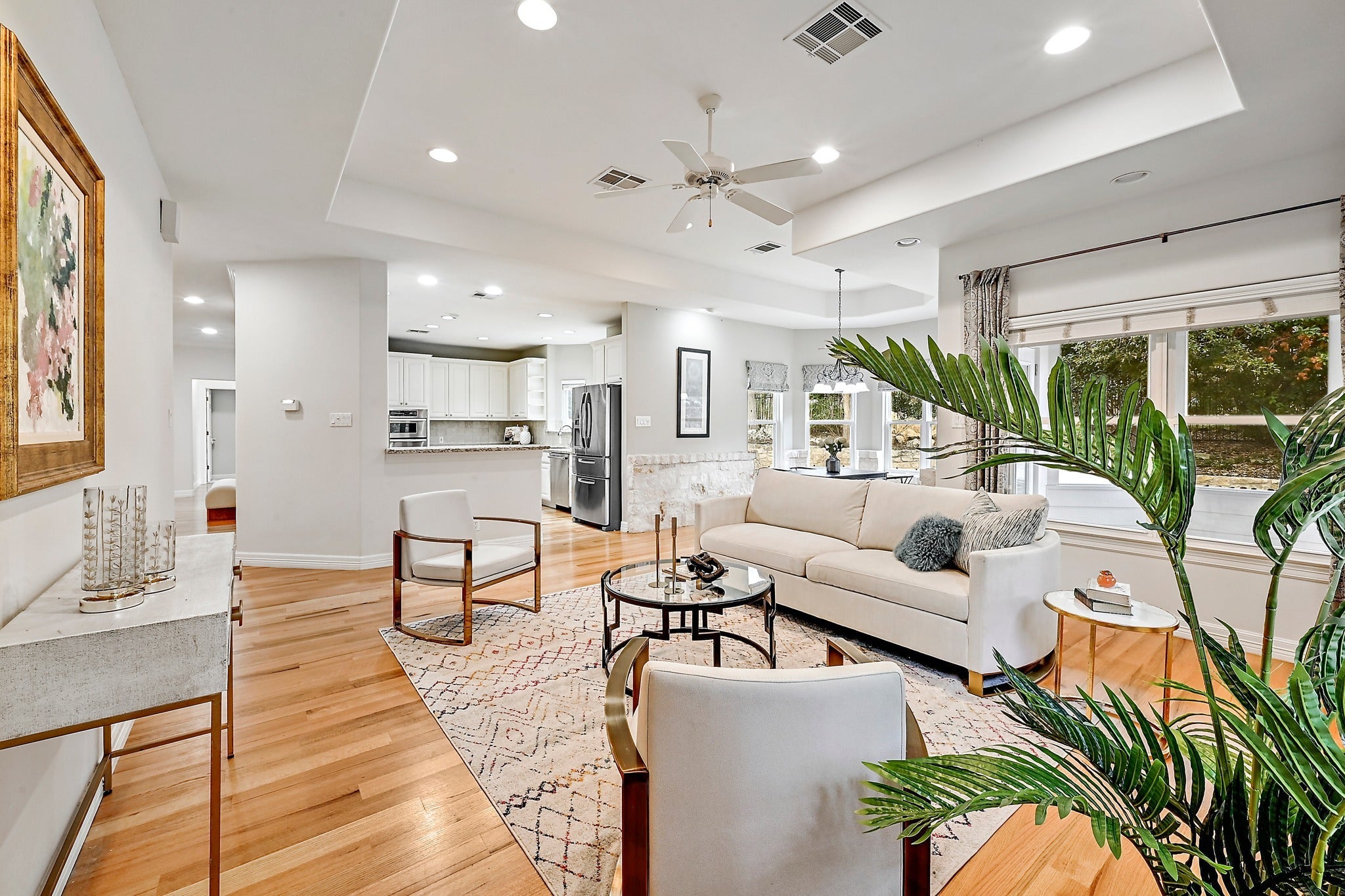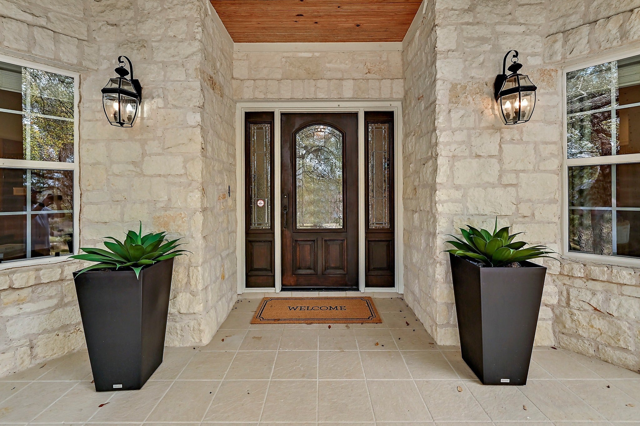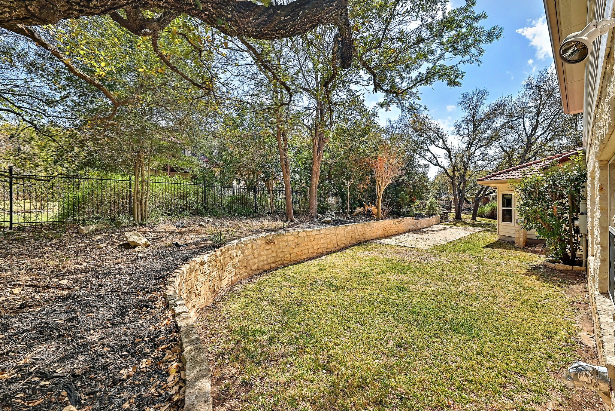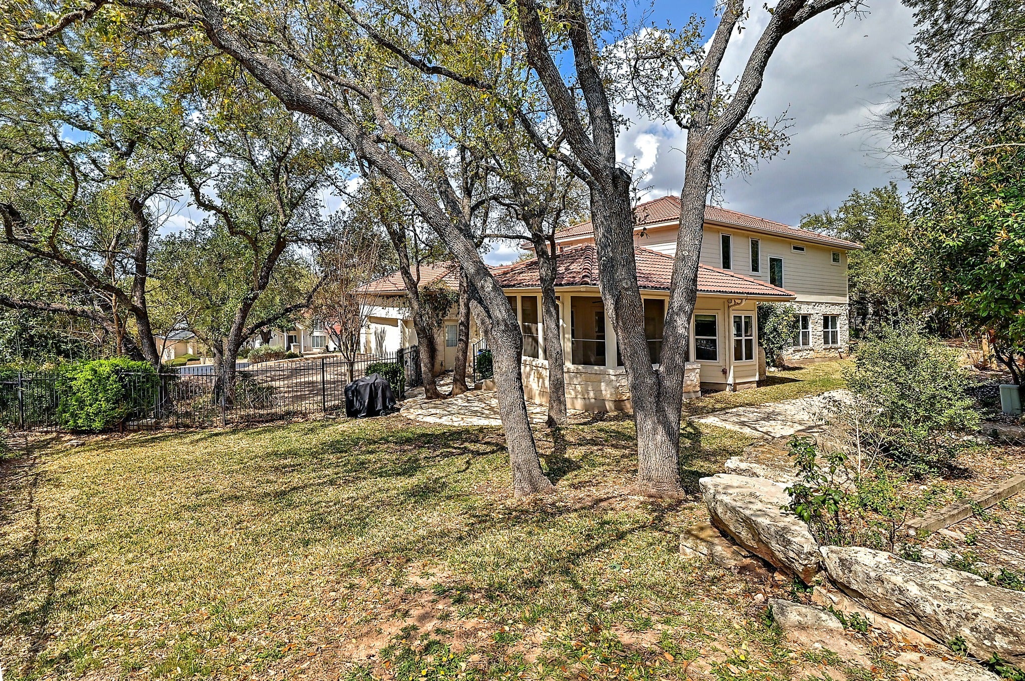 Settled beneath 44 mature live oaks on a rare double lot in the 24/7 guard-gated community of The Hills, 22 Hedgebrook offers the kind of privacy and setting that is genuinely hard to find in Lake Travis. The limestone Hill Country exterior, tile roof, and flagstone walkway create real curb appeal, and the covered front porch overlooks the tree-lined yard. Inside, light-colored hardwood floors, soaring ceilings, crown molding, and substantial baseboards run throughout the main level. The flexible layout includes a formal living room and private office with built-in cabinetry. The kitchen features granite countertops, two-tone cabinetry with a dark center island and induction cooktop, KitchenAid stainless appliances, a French door refrigerator, large pantry, double sink, and a built-in desk nook. Two separate dining areas give the home genuine versatility. A screened-in porch opens to a backyard with mature trees, a limestone retaining wall, and a bocce ball court (or use it for cornhole or petanque). The half bath has an exterior door positioned for a future pool bath. Upstairs, the primary suite is a standout. The bath has been completely remodeled with dual vanity stations, white shaker cabinetry, granite countertops, a glass-enclosed walk-in shower, and a custom closet with drawers and built-in organizers. Both the primary and front bedroom open onto a covered upper-level porch. Two secondary bedrooms each include a private vanity sink and mini walk-in closet, sharing an updated Jack-and-Jill bath with tile surround and glass door. A fifth bedroom with en suite bath completes the main level with an additional bedroom/craft room. The game room is reinforced for a pool table. The laundry room includes a utility sink, ample cabinetry, and direct access to the split three-car garage with overhead storage. Mandatory social membership to The Hills Country Club ($147/month) includes pool access, restaurant dining, and year-round social programming.