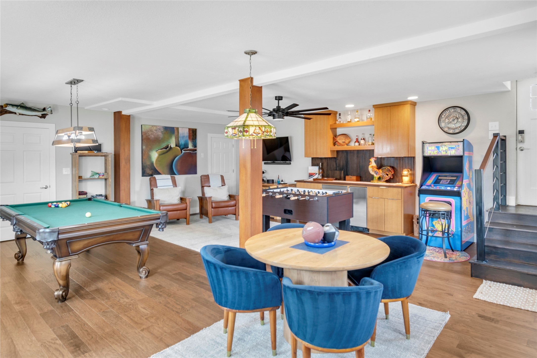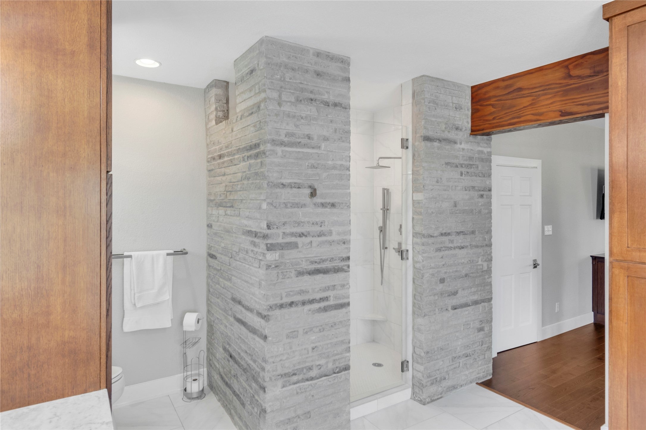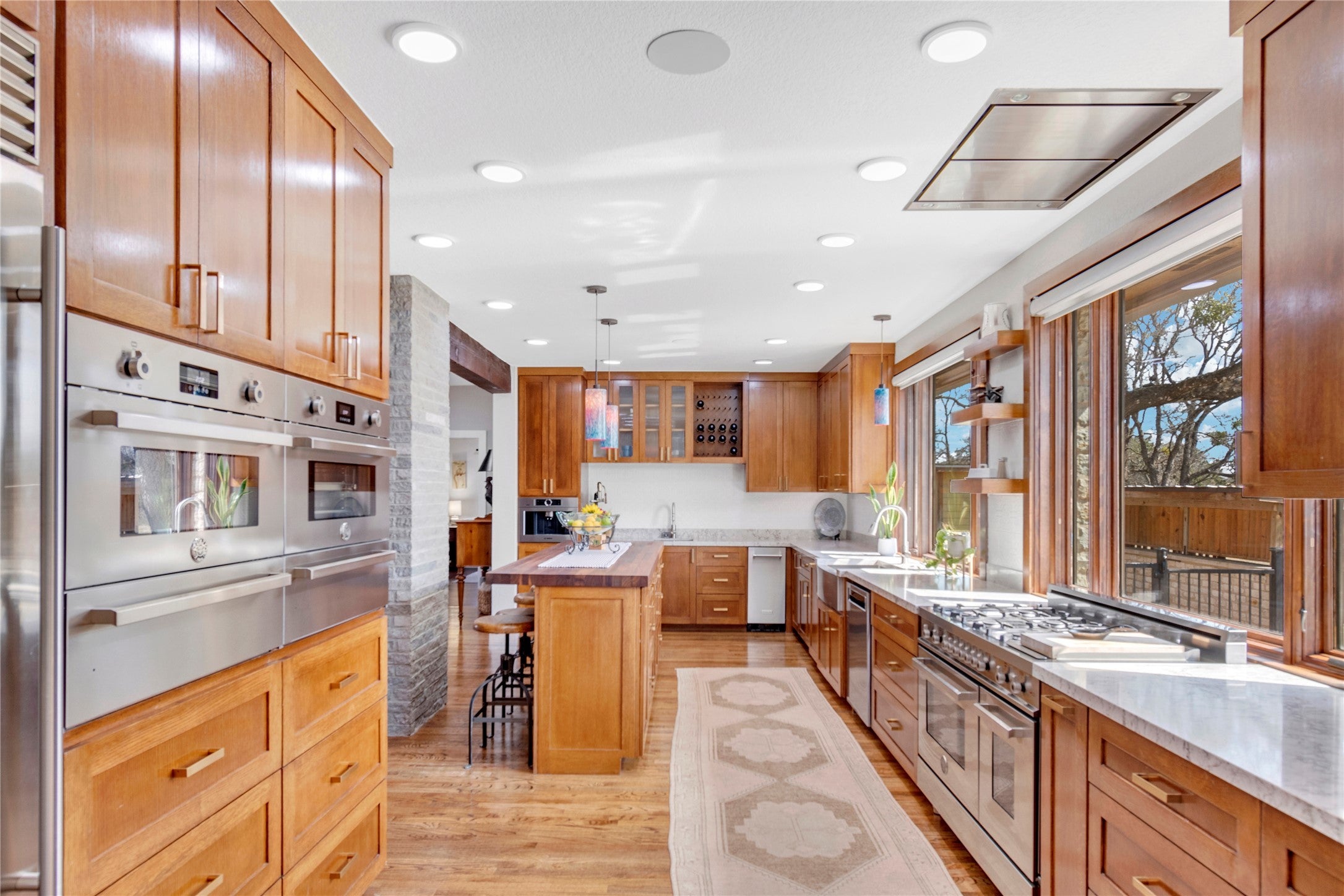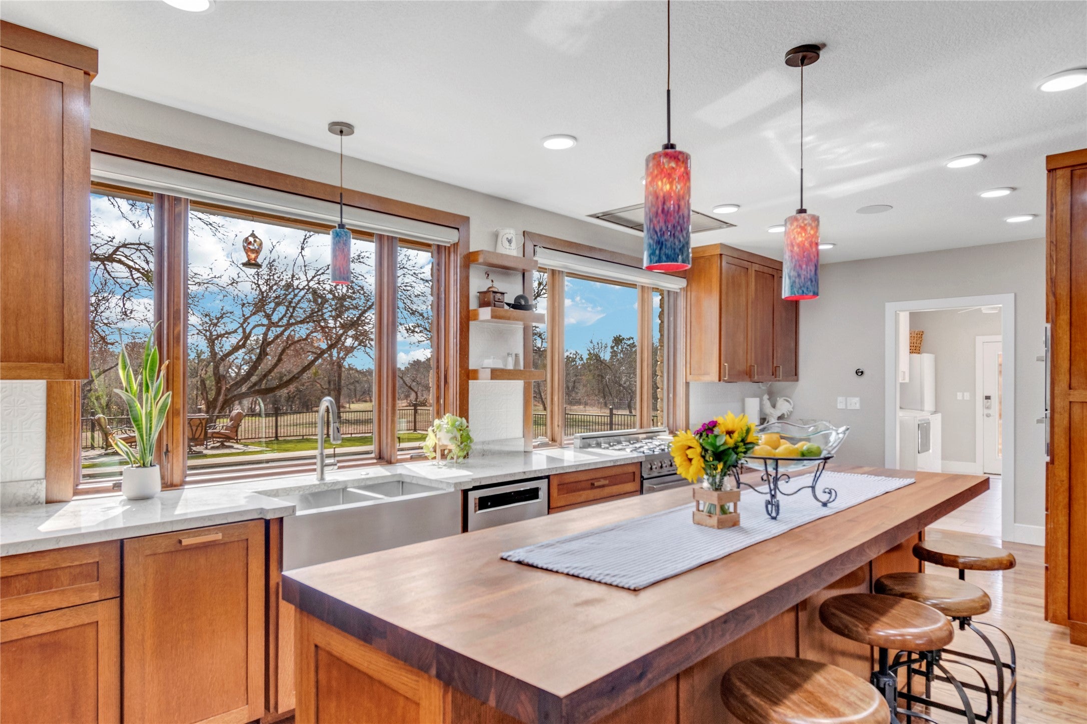 At the end of a quiet cul-de-sac, a secure privacy fence welcomes you to this stunning estate. Entering, you’re greeted by a timeless windmill, a nod to the land’s heritage and the old wagon trail that once crossed here. Set on nearly seven oak-studded acres, this all-stone Hill Country estate has been thoughtfully updated throughout. Custom cabinetry enhances nearly every space in the home, which features 3 bedrooms and 3½ baths. The kitchen, overlooking the pool, boasts electric blinds, high-end appliances, a premium range with double ovens, and a built-in espresso machine, a chef’s dream. On the west end, the private office features a fireplace and a floor-to-ceiling custom cabinet system, plus a Murphy bed for guests. Step outside to discover a private retreat with a 2020-built pool, hot tub, and sauna, all surrounded by low-maintenance turf. An expansive front porch and charming breezeway provide perfect spots for relaxation, while a half-court basketball area offers fun for all. Separate from the main home is a dedicated game room and a private studio apartment with 1 bedroom and 1 bath. The barndominium includes imported Italian laminate flooring, 1 bedroom, 1½ baths, and a laundry room for guests. Upstairs, a bonus/flex space awaits. The impressive 40x40 storage/shop area with epoxy-finished floors is on the north end of the barndo. A garden area with a tool shed and a large dog run complete this exceptional setting. With most furnishings negotiable, this luxury estate is a true gem. Call for a private tour today!