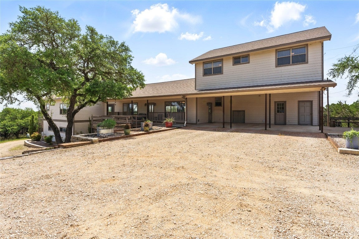 LOCATION,LOCATION,LOCATION ...so close to Austin, but just outside of the county line, convenience at it's finest! Experience the pinnacle of hill-country living in this custom-built home designed for privacy, entertaining, and breathtaking hill top views. Sun-drenched spaces flow throughout an open floor plan with every detail crafted to live a comfortable life style! Bring your vision and create your dream home. Do you prefer a modern Wyoming ski chalet with high wooden beams and a stone front facade? Or do you dream of a coastal home at the top of a mountain with endless hill country views. Maybe a hunting lodge? The possibilities are endless! The home is a ready for move in! The kitchen features custom cabinets, two sinks, an island bar, and a large pantry, with an optional gas connection ready for a gourmet cooktop. Two generous primary suites: one on the main level, with a separate entrance, shower, dual vanities, second washer/dryer, Jacuzzi tub, abundant storage, plus a private deck for starry evenings. The upstair's primary suite has dual vanities and closets, plus two additional bedrooms connected by a Jack & Jill bathroom. Entertainment-ready spaces including a dedicated game room and generous living areas that invite gatherings and lingering with friends and family. Outdoor living at its best: decks on all sides showcasing stunning sunrise views and private, tranquil settings. Custom touches for efficiency: Storm shelter/mechanical room/storage for peace of mind and practicality, 45,000-gallon whole-house rainwater system, plus passive solar design for sustainable living. High-efficiency HVAC with water-cooled condenser and propane heating for comfort in any season. Exterior highlights include a 3-car carport on the main level and a workshop/2-car garage on lower level. The outside is a blank canvas to create your outdoor paradise, a resort pool and pool house, backyard grilling area, putting green, corn hole? Or maybe a barn and a couple of horses?