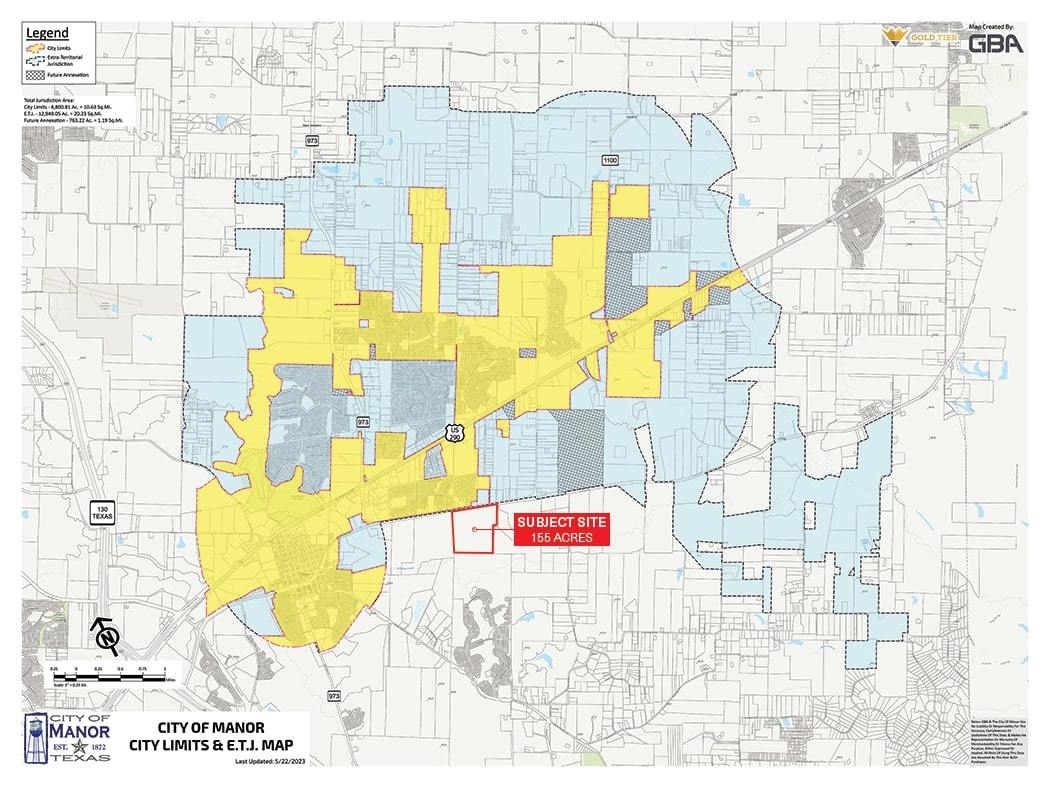 An unbelievable opportunity to acquire 155 acres in the heart of Manor. This prime property boasts an exceptional advantage with 2,700 feet of railroad frontage, a prospect that has received preliminary approval from WATCO for rail access. Furthermore, the adjacent frontage road, Old Highway 20, is poised for expansion, as it is prominently featured on the City of Manor's Thoroughfare Map for a future upgrade to 4 or 5 lanes. Currently situated within Austin's ETJ (Extraterritorial Jurisdiction), this property also stands to benefit from Senate Bill 2038, which could potentially facilitate its inclusion within the City of Manor. In terms of infrastructure, an 8-inch water line and a 12-inch sewer line are conveniently located across the street on Old Highway 20, while electric service is readily near the site. Don't miss this remarkable opportunity to secure a valuable piece of land in a rapidly developing area. **Any purchase must do their independent research regarding the development potential of this site.** Property Highlights Adjacent to New Developments, Including Major Manufacturers Austin ETJ - Potential Swap to City of Manor 8” Water Line & 12” Sewer Line Approx. 2,700 Feet of Railroad Frontage Old Highway 20 Road Expansion