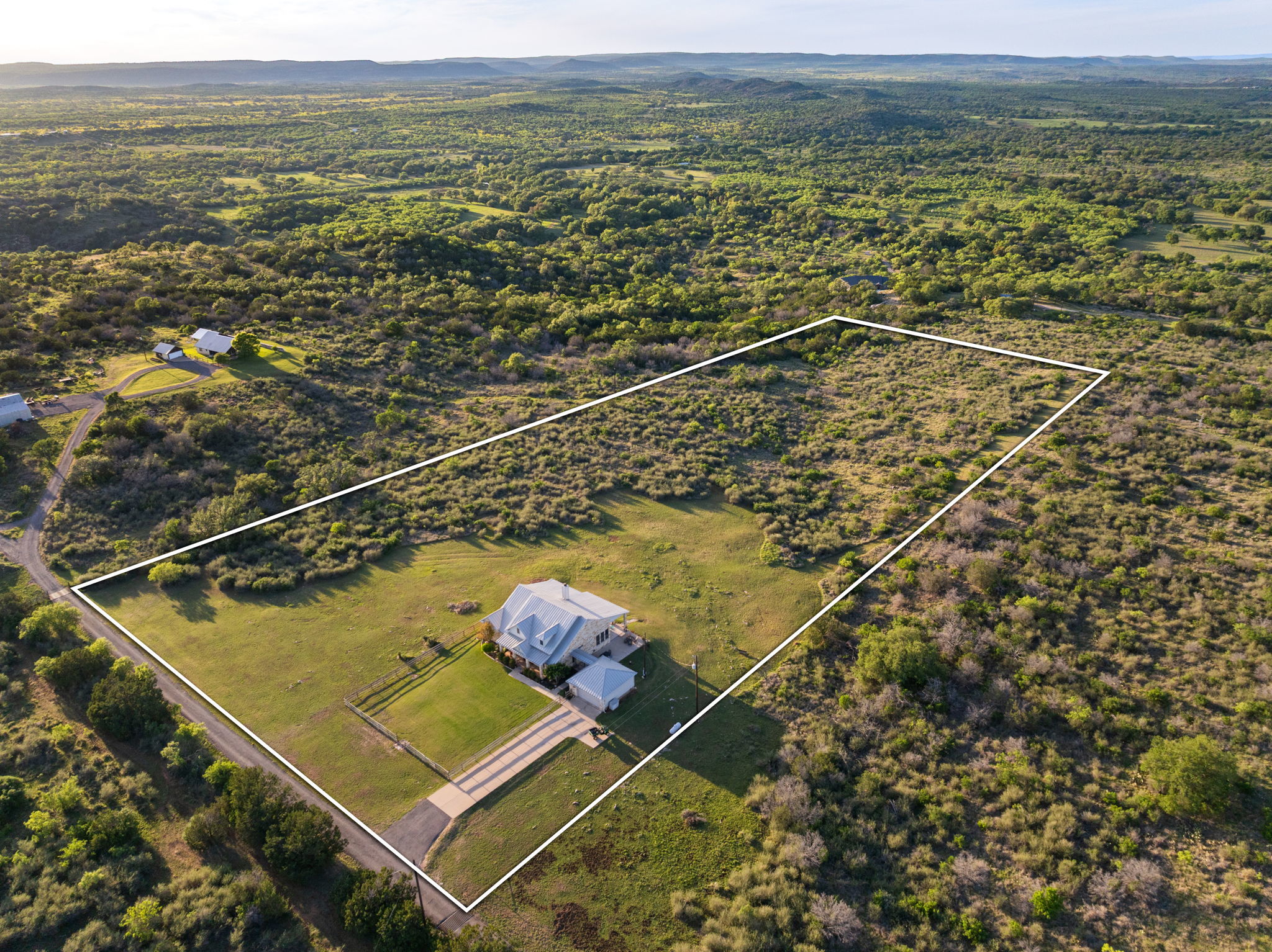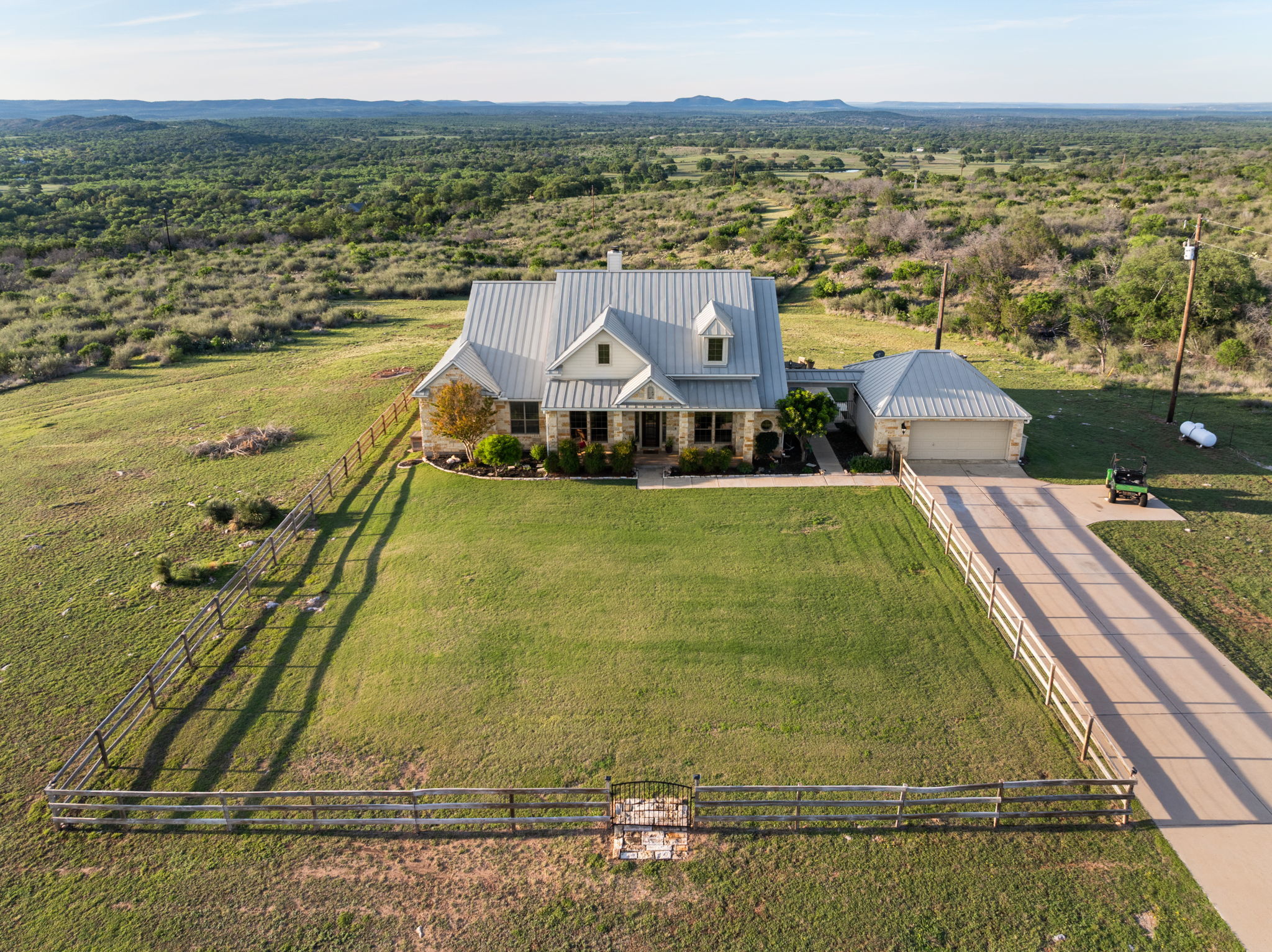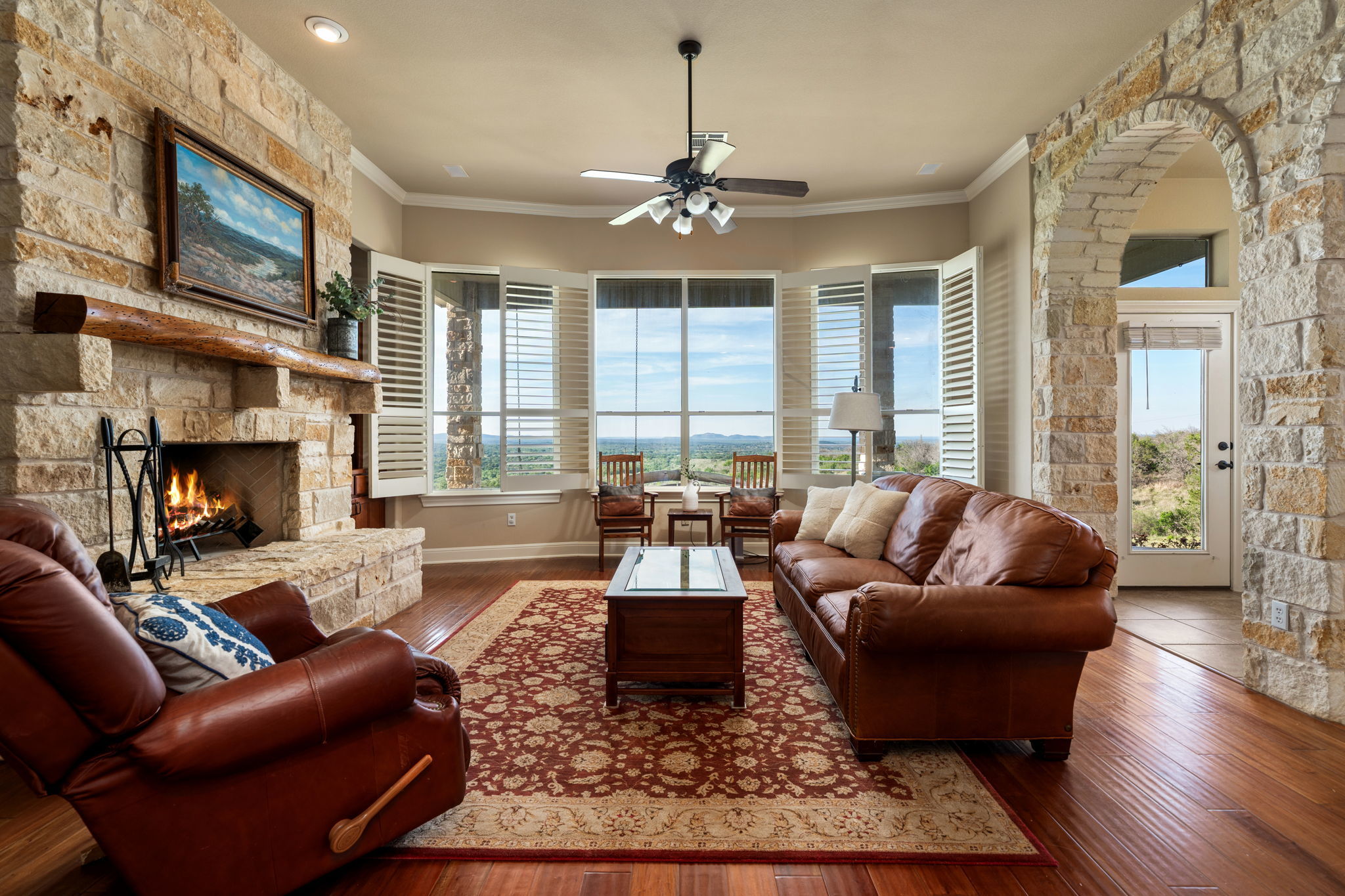 Set on 9.98 private acres in Round Mountain, this Hill Country retreat offers breathtaking panoramic views and a peaceful setting with no HOA. Built in 2008, the 2,924 sq ft home features 3 bedrooms, 2.5 baths, and a thoughtfully designed open floorplan that blends comfort and style. Inside, you’ll find rich architectural details including a stunning stone fireplace, accent stone walls, and elegant arches that add character and warmth throughout. The spacious layout flows seamlessly, with a dedicated game room offering additional space for entertaining or relaxing. Step outside and take in the wide-open skies and rolling Hill Country landscape. The front yard is fenced, providing added functionality while maintaining the expansive feel of the property. A rare opportunity to own acreage, views, and timeless design in a serene Texas setting. Buyer to verify all information.