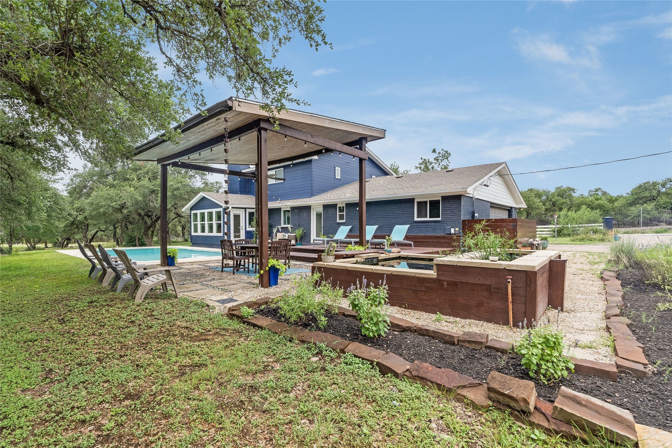 Modern fully renovated Country Estate with an amazing outdoor entertaining area on 4.53 acres on a private road just 22 mins to downtown Austin. This stunning property is located between Oak Hill & Dripping Springs. The home features 4 beds/3 full baths, 3 large living/dining areas, a gorgeous light filled kitchen, custom built stairs, wood burning fireplace & a 600 sqft garage w/a private attached workshop! 2025 Upgrades & Improvements Brand new windows & all new full light exterior doors, New quartz countertops in the kitchen/baths & laundry room, All new interior paint, Custom painted kitchen/laundry & hall linen cabinets, New lighting & plumbing fixtures, New LPV flooring in the laundry & entire upstairs, Acacia hardwood in the downstairs bedrooms, New modern large profile tile in downstairs bathrooms and THAT’S JUST IN THE HOUSE! OUTDOOR Updates & Features Include: Newly rebuilt 450 sqft lounging deck, 18 ft modern pitched roof pergola for outdoor dining, Serene royal koi pond surrounded by large native beds/xeriscaping, Newly resurfaced 18,000 gallon inground pool (2025), Brand new hardiplank siding & paint (2025) & brand new paint throughout interior of home KEY FEATURE This home has BOTH city and well water!!! Additional Outdoor features: 700 sqft deer fenced garden, 100 foot chicken run, Custom built chicken condo w/nesting boxes, 500 sqft storage barn, 4 newly installed raised garden beds, custom built inground Royal koi pond, well house, 200 sq ft she shed, mower shed ALL organic dirt used in the garden. NO PESTICIDES used on this property EVER! 20+ minutes to downtown Austin, 5 minutes to Bellterra shopping & dining, 12 mins to Dripping Springs & 2 brand new HEB shopping centers w/in 5 mins All of this on your own little private road across from a huge 360+ acre environmentally protected ranch where you can see exotic game & native texas longhorns graze right out of your front living room window! Super unique property a must see!