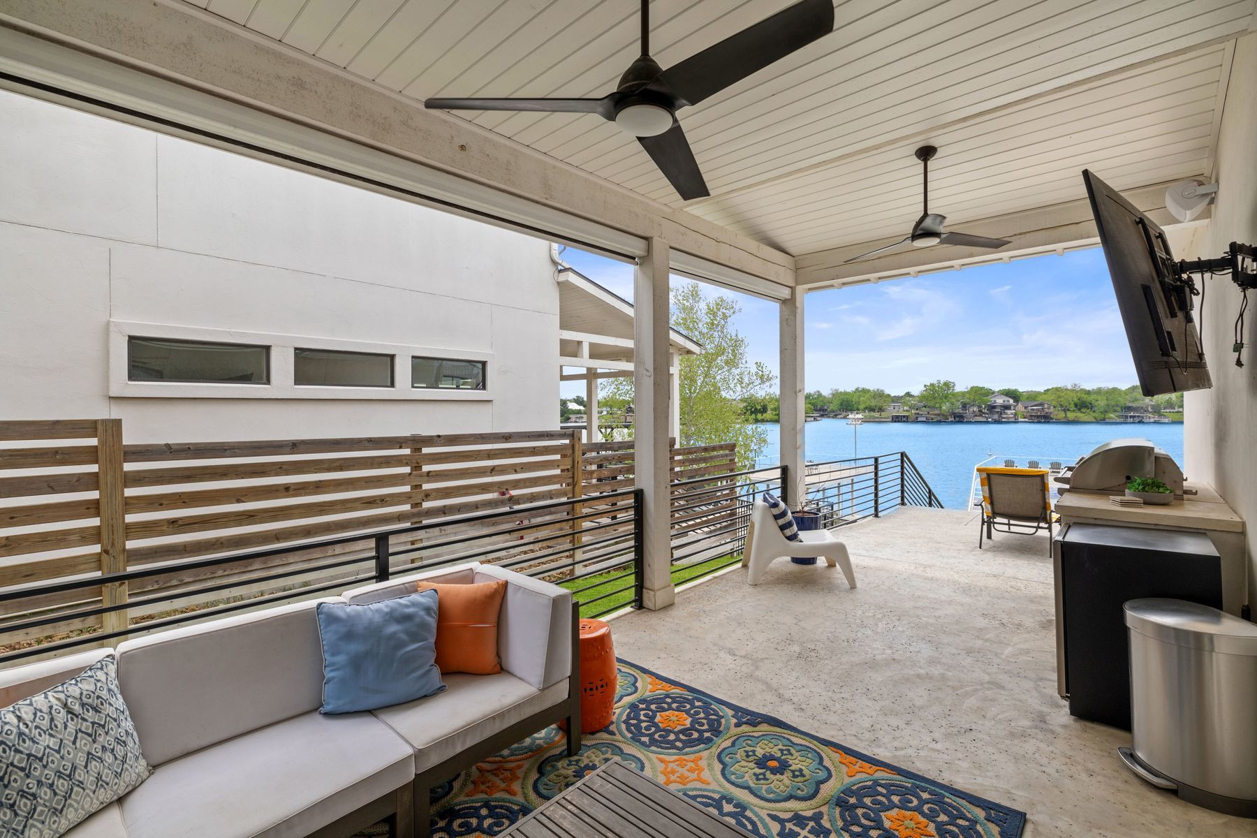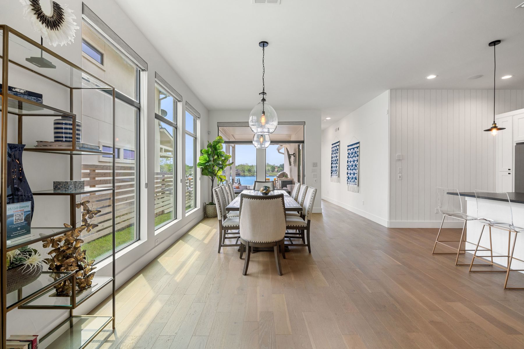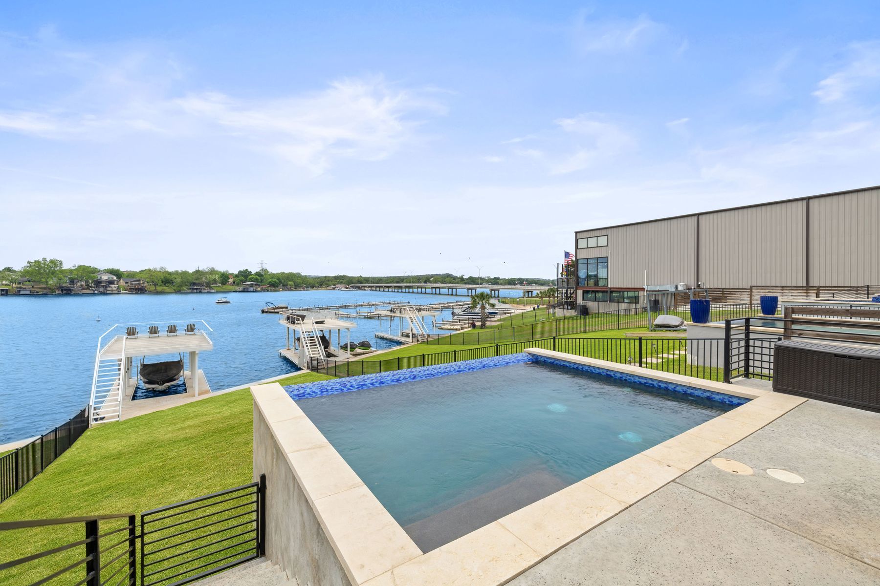 Premier Lakefront Modern Farmhouse at 1324 Euel Moore Dr, Kingsland, TX This beautiful lake house was built in 2018 by premier builder Keith Wing Custom Builders, this fantastic 3,453 sq ft modern farmhouse is a stunning masterpiece on the 53' open waterfront ofLake LBJ in Kingsland, TX. Everything about this 4-bedroom, 4.5-bath property is outstanding, offering the perfect blend of luxury,location. Step inside to discover a bright, open-concept design with stylish high-end details, from sleek accents to beautiful hard woodflooring. The gourmet kitchen, an entertainer’s dream, boasts premium appliances, quartz countertops, and a large island, flowing seamlessly into the living area with panoramic lake views. The primary suite is a serene retreat with a spa-like en-suite, while three additional bedrooms, each with private baths, provide ample space for family or guests. A vibrant game room with built in bunks adds fun for all ages. Outside, the Lake LBJ lifestyle shines with a custom pool, outdoor kitchen, and expansive living space perfect for weekend retreats or short-term vacation rentals, offering a proven income model. The close proximity to Boat Town with their restaurant and fun activities adds to the vacation experience and ease of enjoyment. The boathouse, complete with an upper deck entertaining area, invites boating, fishing, or jet skiing on the lake’s open waters. Stunning east-facing views capture vibrant sunrises.