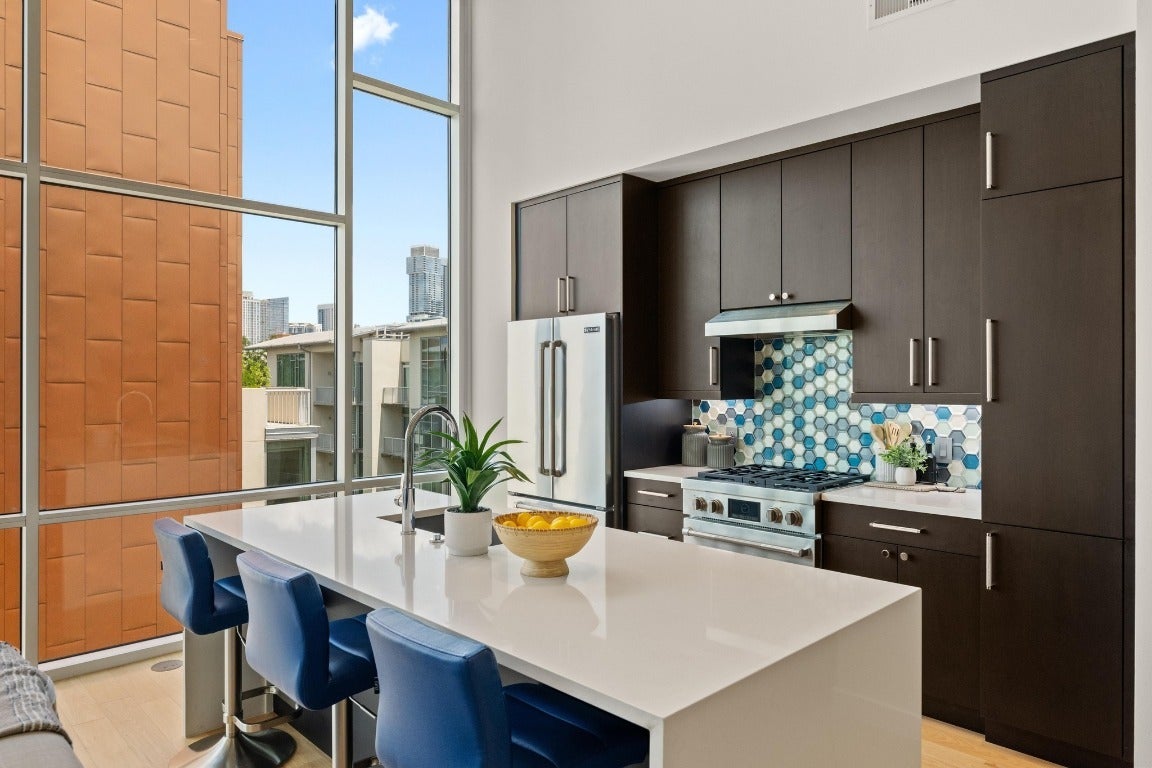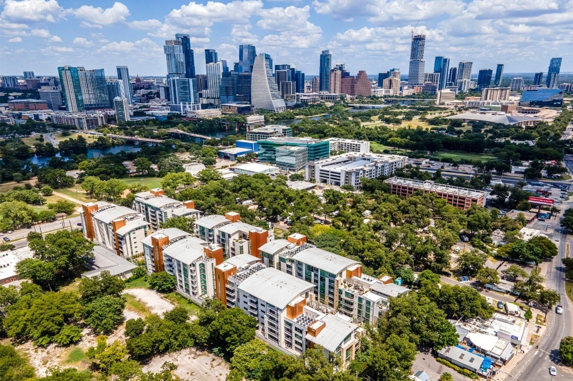 Experience Austin from a vantage point few ever experience, perched high above the city in a penthouse unit at Barton Place Condominiums. Located just across the river from downtown and steps from Barton Springs, Zilker Park, and the Town Lake Hike & Bike Trail, this residence blends the energy of city living with the serenity of Austin’s most beloved green spaces. This single-level, two-bedroom, two-bath home with convenient private storage unit directly across from the parking spaces in the parking garage is designed for both style and comfort. Soaring ceilings, warm wood floors, and oversized windows frame sweeping views of the river, Hill Country, and Zilker Park. The open main living space connects seamlessly to a sleek kitchen anchored by an oversized center island with waterfall edge, quartz countertops, Jenn-Air stainless steel appliances, including a gas range, that extends to the living room and out to a private balcony, where the views are simply unforgettable. The primary suite is a private retreat with dramatic ceilings, a luxury ensuite bath, and its own balcony for quiet mornings or starlit evenings. A second bedroom, conveniently located near the guest bath, is ideal for visitors or a dedicated home office. Barton Place offers a host of resort-style amenities: a heated saltwater pool with lounge and BBQ area, four rooftop terraces with grills, a community garden, a fitness center, dog park, Owner’s lounge with kitchenette, and a rentable guest suite for overnight visitors. This secure, gated community includes 24-hour concierge service, two reserved parking spaces, and a private storage closet is conveniently located directly behind the parking spaces. From sunrise runs along the lake to evenings on “Restaurant Row,” this penthouse is perfectly placed to enjoy everything Austin has to offer, nature, nightlife, and the unique character of the city you love, all right at your doorstep. Buyer to verify all info.