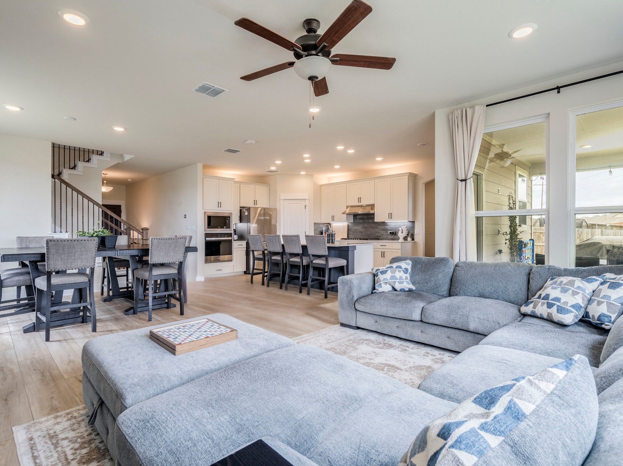 Move in Special: Get Approved for Lease (& Pay Deposit) BY May 1st, Move In June 1st-June 15th, GET HALF MONTH FREE. Welcome to 297 Tree Nut Loop, a beautifully upgraded 3-bedroom plus office, 2.5-bath home offering 2,331 square feet in the sought-after Lockridge series by Pulte, ideally situated on a premium cul-de-sac lot backing to greenspace with no direct rear neighbors. Meticulously maintained, this home features no carpet with EVP flooring throughout, crown molding, full-length linen drapes, and high-end finishes at every turn. The open-concept kitchen showcases a charcoal backsplash, light quartz counters, obsidian single-basin sink, pull-down faucet, and soft-close white cabinetry, while a pocket office off the mudroom, downstairs half bath, and a flexible front office or optional fourth bedroom provide excellent functionality. Upstairs, the private owner’s suite offers quick access to the laundry room, a spacious walk-in closet, and a spa-style bathroom with an extended walk in shower, bench seating, and pebble stone flooring, along with a second living room loft and generously sized secondary bedrooms, window seats, walk in closet and full bathroom with double vanities. The extended back patio with bistro lighting is perfect for relaxing or entertaining, complemented by full gutters, irrigation, a tankless water heater, solar panels for reduced utility costs and smart home system. Located in the vibrant Sunfield community in Buda, residents enjoy access to multiple amenity centers including resort-style lazy rivers and a Junior Olympic pool, walking distance from the home is the 2nd full lazy river amenity center, along with parks, ponds, splash pads, and dog parks, all within close proximity to Sunfield Elementary and just miles south of downtown Austin. A limited time move in incentive offered. Owner to cover lawn service and include washer, dryer, and refrigerator, this home offers an exceptional blend of privacy, upgrades, and lifestyle.