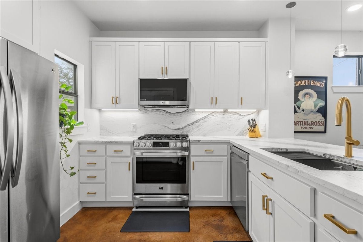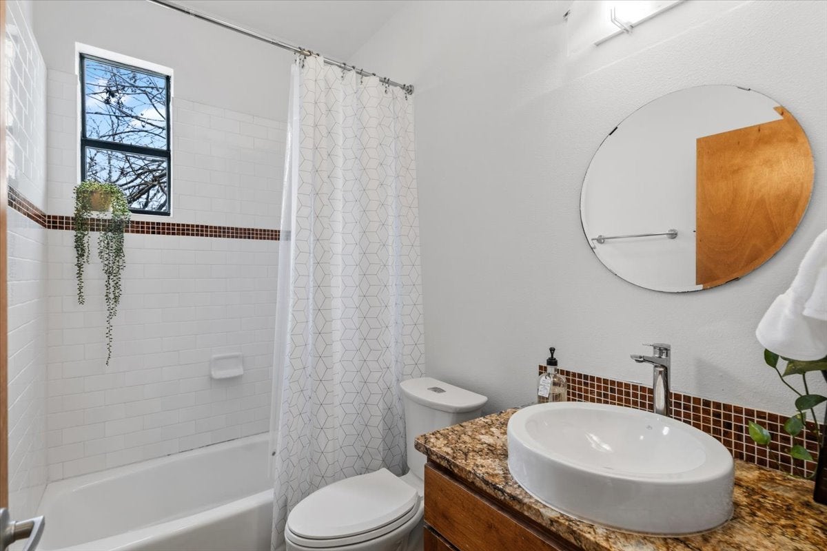 Perfectly positioned just off iconic South Congress and less than two miles from downtown Austin, this beautifully updated three-story residence offers an exceptional blend of urban lifestyle, modern design, and private outdoor living. Built in 2009 and recently refreshed with a brand new roof and full professional interior and exterior repaint, the home provides turnkey living in one of Austin’s most vibrant neighborhoods near St. Edward’s University. A charming fenced front garden with a sliding metal gate welcomes you with lush greenery, creating a rare retreat so close to downtown. The backyard is designed for entertaining, featuring crushed gravel landscaping and a spacious gazebo ideal for evening gatherings, weekend brunches, or relaxed outdoor living. Inside, the first floor showcases sleek concrete floors, abundant natural light, and an open layout perfect for both everyday living and entertaining. The newly renovated kitchen is the centerpiece of the home, highlighted by a dramatic Cambria quartz waterfall, large five-burner gas range, and new dishwasher and microwave. This level also includes a powder bath, utility closet, generous under-stairs storage, and access to the updated one-car garage featuring epoxy floors, fresh paint, and modern lighting. Upstairs on the second level, three bright bedrooms offer comfortable living spaces filled with natural light. The primary suite features a private balcony and spa-inspired bathroom with dual vanity and pebble-floor walk-in shower. The top-floor loft provides a versatile second living area ideal for a media room or inspired home office. From this elevated vantage point, enjoy treetop views with glimpses of the downtown Austin skyline. The space also includes generous storage and walk-in attic access. With thoughtful updates, flexible living spaces, and an unbeatable location near South Congress dining, entertainment, and downtown Austin, this home captures the best of central Austin living.