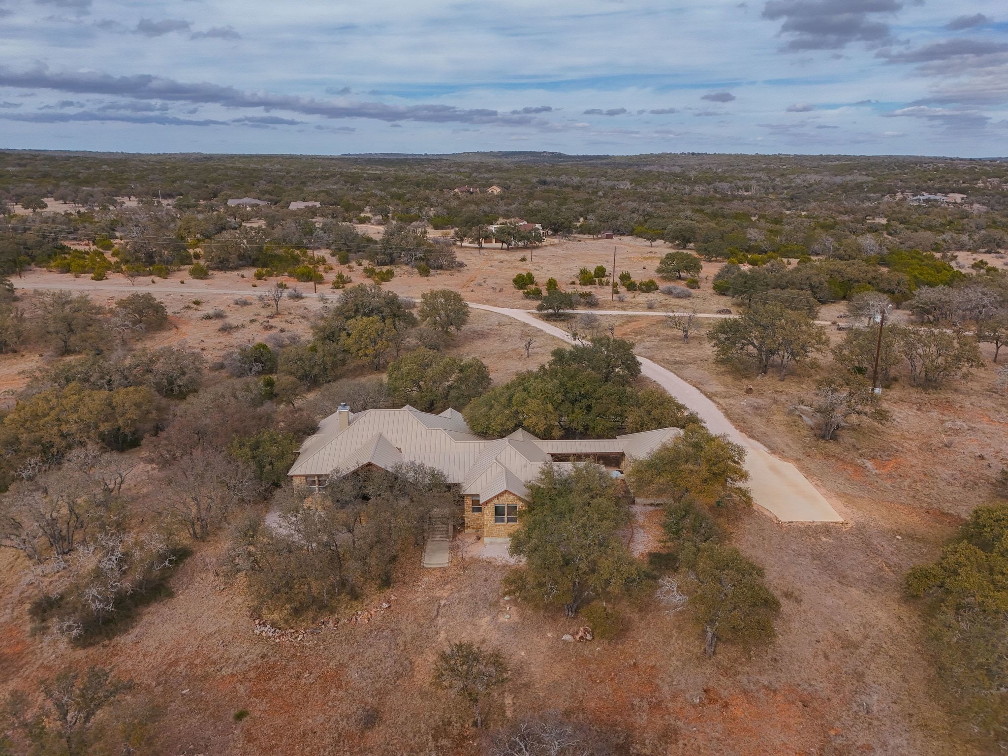 Introducing a rare Hill Country retreat within Wolf Creek Ranch--a private, gated ranch community located approximately one hour west of Austin, with sweeping views of Adams Bluff and Lake Buchanan. This remarkable property offers the privacy of just over 23 acres, combined with access to over 1,300 acres of preserved ranchland, creating a lifestyle that feels expansive yet thoughtfully managed. The land features mature live oak trees, rolling terrain, and captivating Hill Country topography that provides both beauty and seclusion. The main residence spans 3,343 sf and showcases soaring ceilings, exposed wood beams, stained concrete floors, and a striking stone fireplace that anchors the primary living space. Large windows and French doors fill the home with natural light and open to a covered outdoor living space, creating a seamless connection to the surrounding landscape. The open and functional floor plan is designed for both everyday living and entertaining. Highlights include an oversized kitchen with a built-in breakfast nook, a formal dining room, a dedicated office, a private guest wing, and a spacious primary suite positioned to capture southwestern views across the property. Outdoor features include gently rolling acreage, mature oaks, free-roaming livestock, and a large garage with workshop space, double roll-up doors for easy RV or boat parking, and a heated and cooled flex area. Residents of Wolf Creek Ranch enjoy access to equestrian facilities, miles of riding and hiking trails, private Lake Buchanan access, a creekside pavilion with a swimming hole, a private helipad, and shared agricultural tax benefits. If you are looking for ranch-style living without hundreds of acres to maintain, don't miss your opportunity to experience this exceptional property.